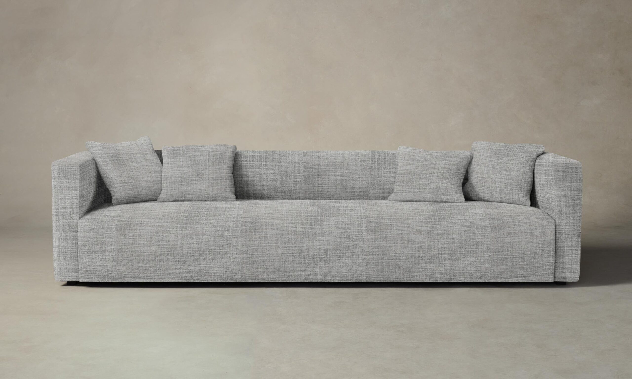 The Breuer sofa draws inspiration from the bold and graphic shapes of brutalist design. Tightly upholstered for a sleek look, it has a low-lying seat accompanied by plush throw pillows.