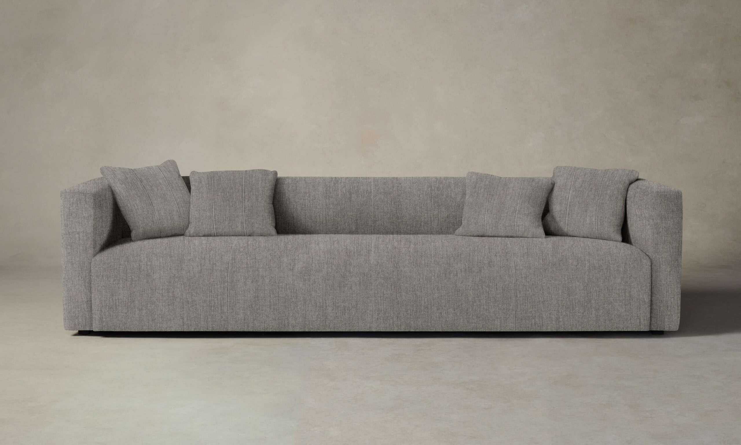 The Breuer sofa draws inspiration from the bold and graphic shapes of brutalist design. Tightly upholstered for a sleek look, it has a low-lying seat accompanied by plush throw pillows.