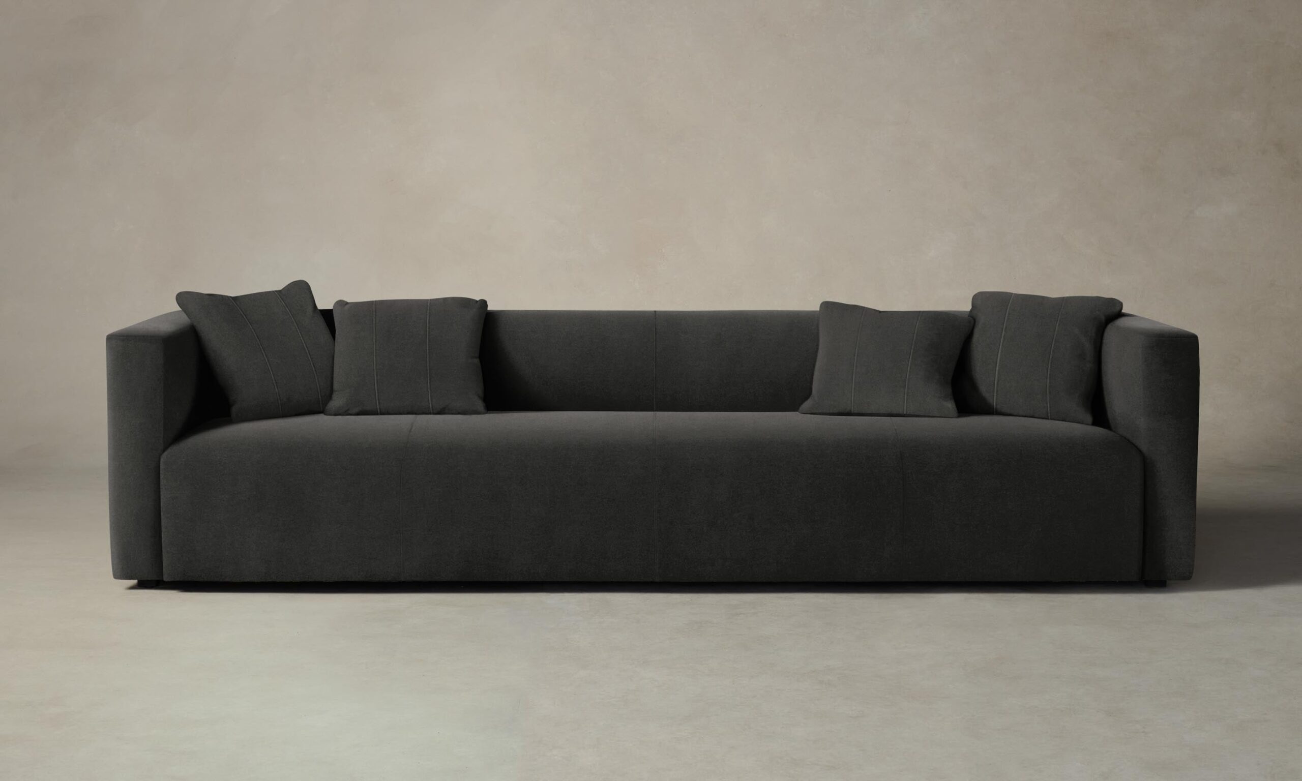 The Breuer sofa draws inspiration from the bold and graphic shapes of brutalist design. Tightly upholstered for a sleek look, it has a low-lying seat accompanied by plush throw pillows.