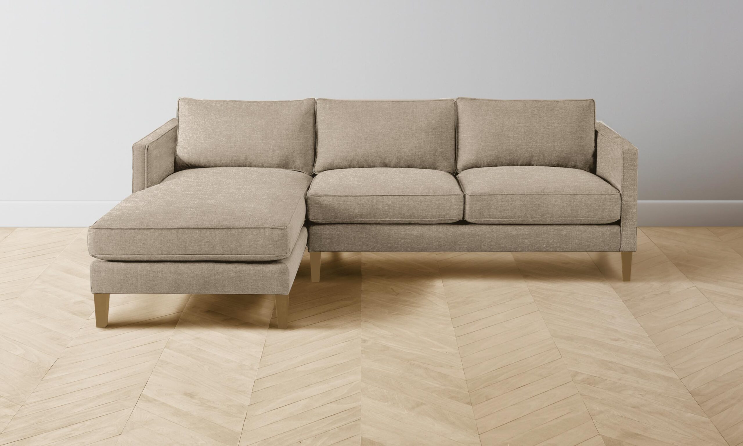 The Crosby sectional is a testament to the charm of simplicity. With a slender profile that suits spaces small and large, the design is neatly upholstered with cord welts and sits atop tapered legs.