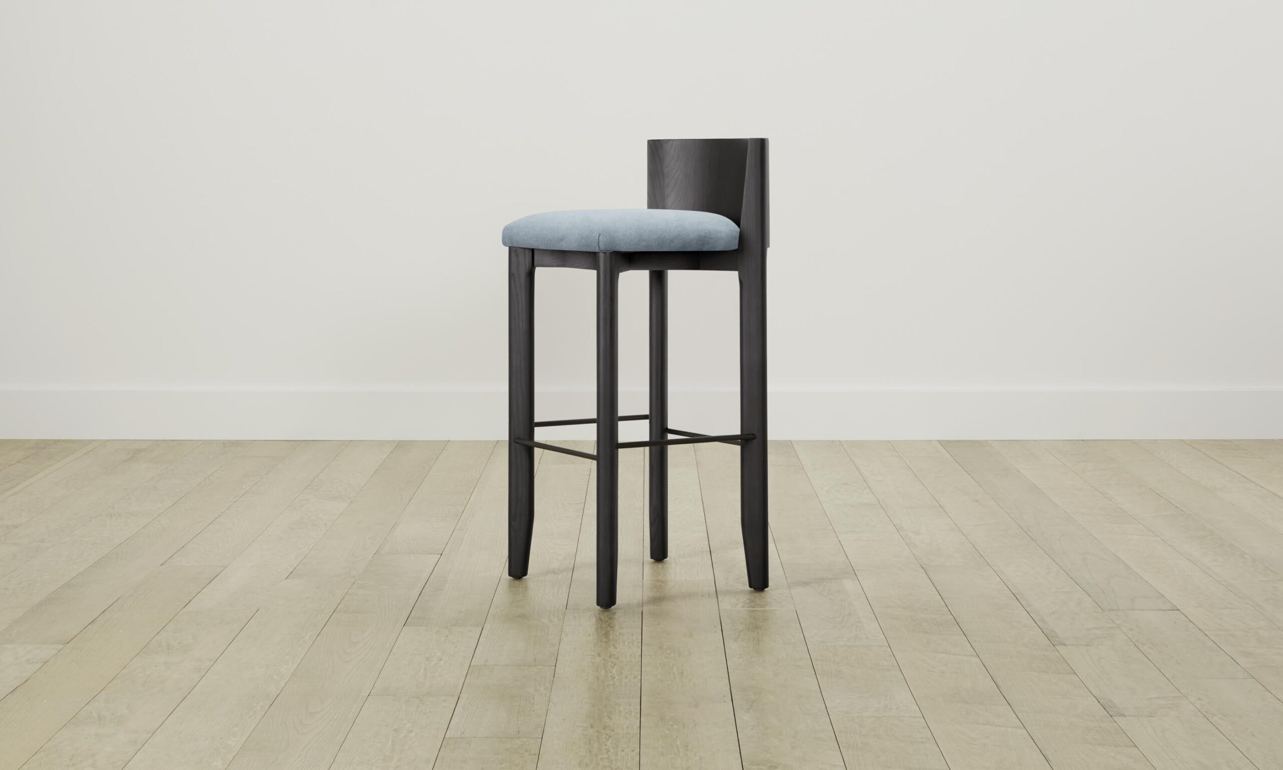 The Delancey bar and counter stool brings depth and dimension into your space with its mixed materiality. Handcrafted from ash with a curved back, it has a plush upholstered seat and metal footrest.