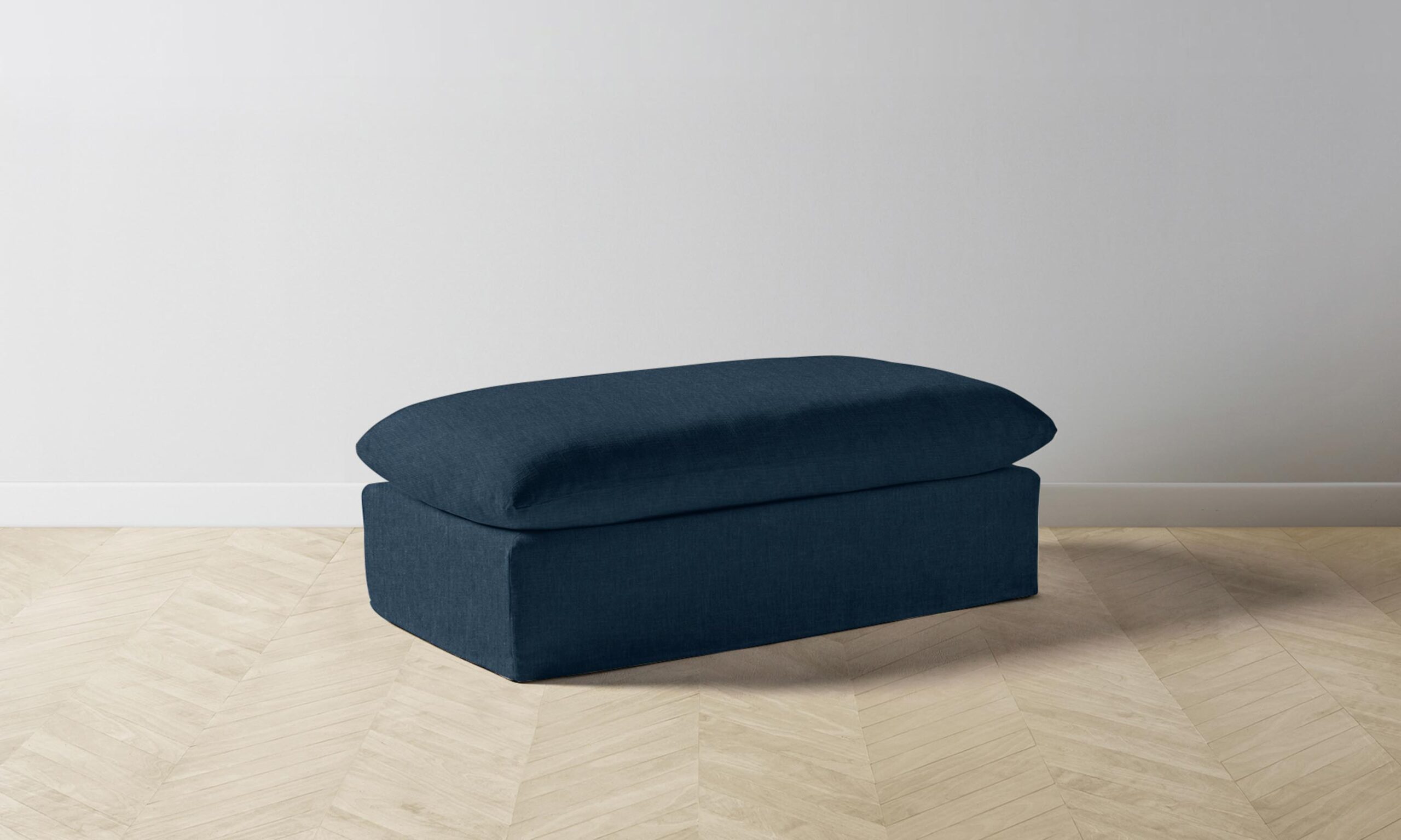 The Dune ottoman is a vision of effortlessness and ease. It boasts a plush cushion and relaxed slipcover that drapes elegantly to the floor.