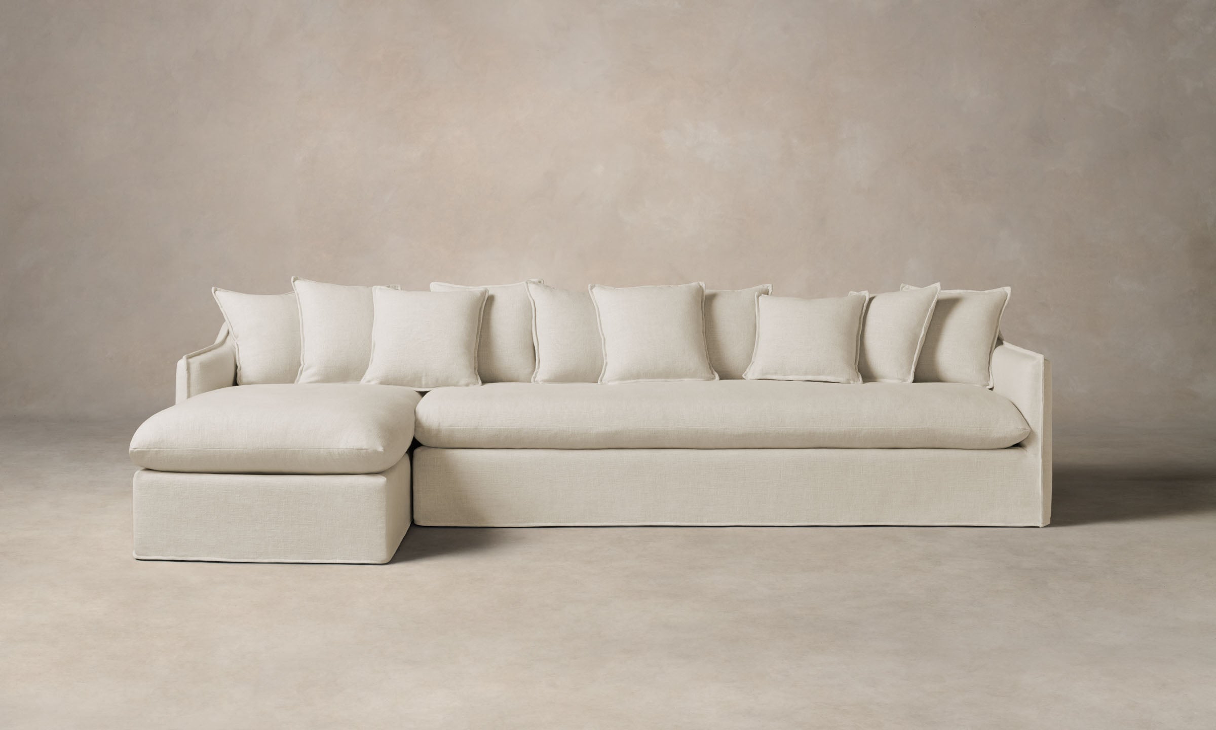 The Dune sectional is a vision of effortlessness and ease. It boasts a deep seat, plush cushioning, and relaxed slipcover with hand-sewn flange seams for an elegant finish.