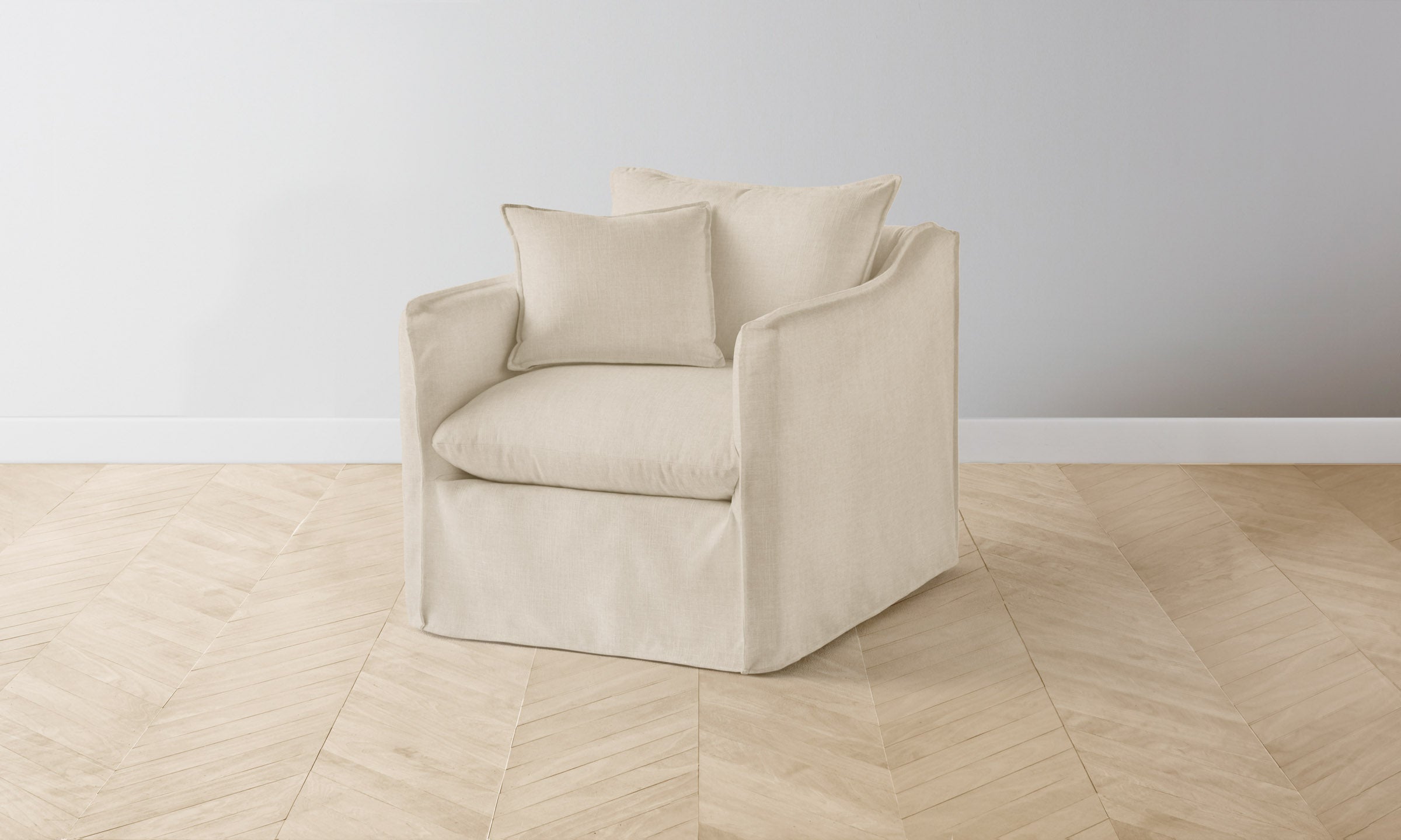 The Dune swivel chair is a vision of effortlessness and ease. It boasts a deep seat, plush cushioning, and relaxed slipcover with hand-sewn flange seams for an elegant finish.