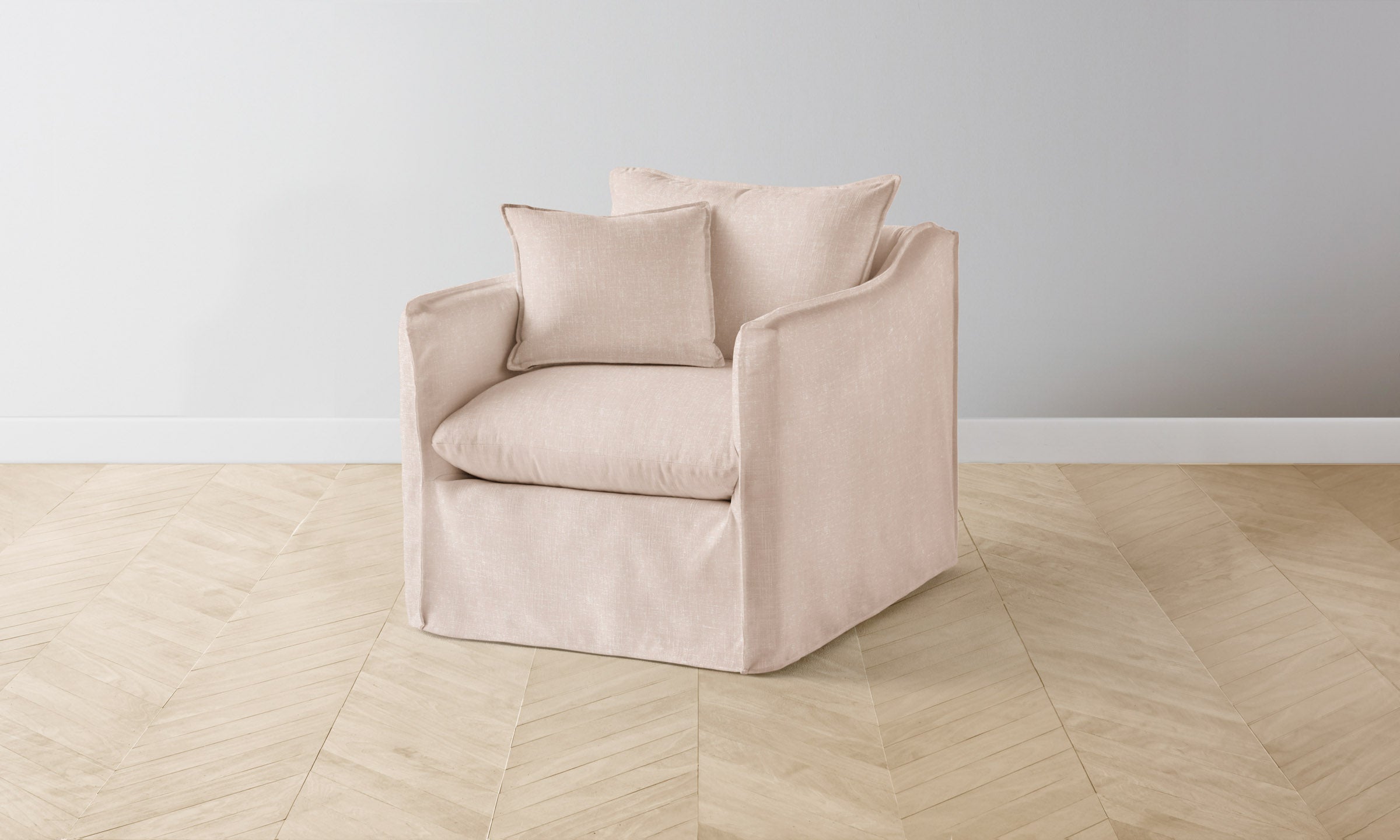 The Dune swivel chair is a vision of effortlessness and ease. It boasts a deep seat, plush cushioning, and relaxed slipcover with hand-sewn flange seams for an elegant finish.
