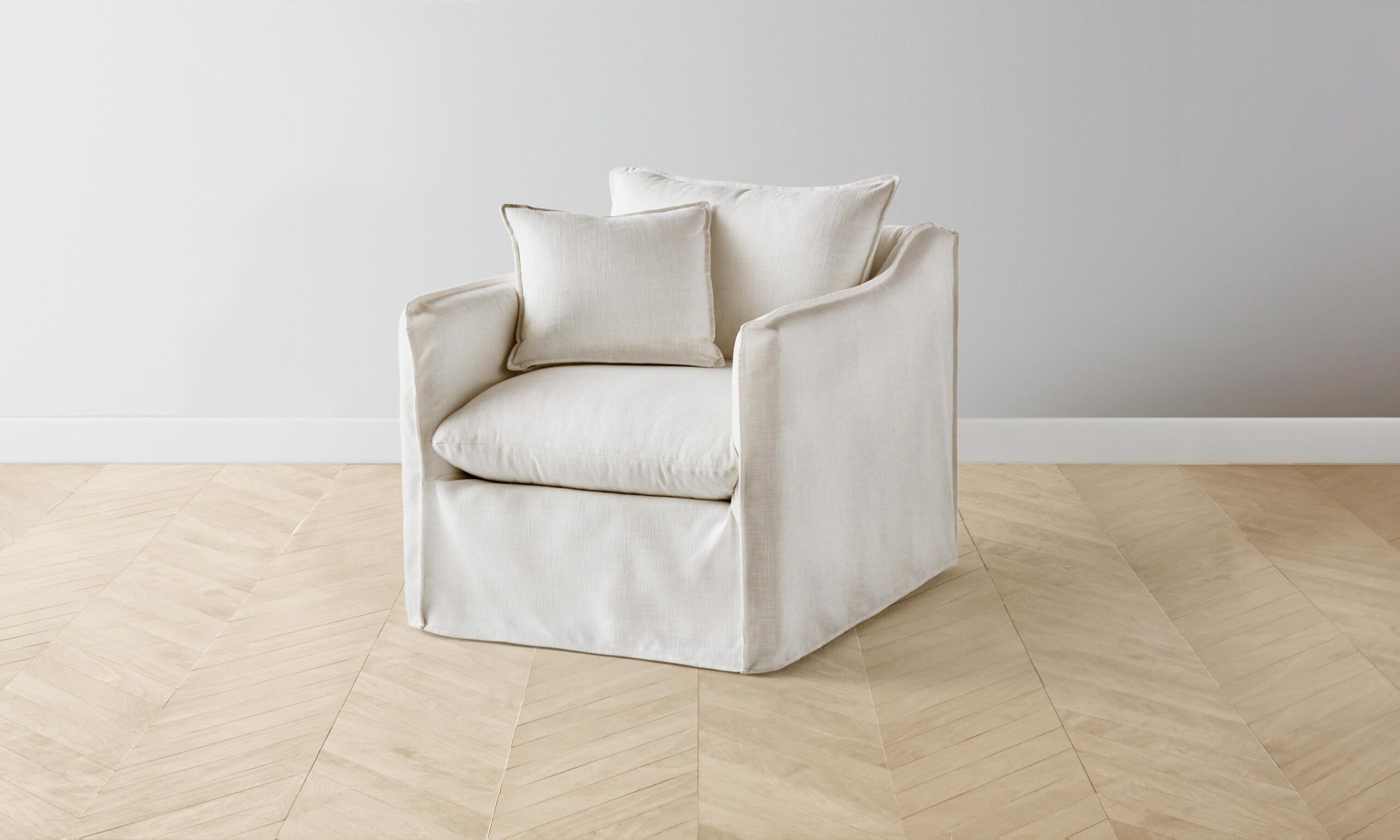 The Dune swivel chair is a vision of effortlessness and ease. It boasts a deep seat, plush cushioning, and relaxed slipcover with hand-sewn flange seams for an elegant finish.