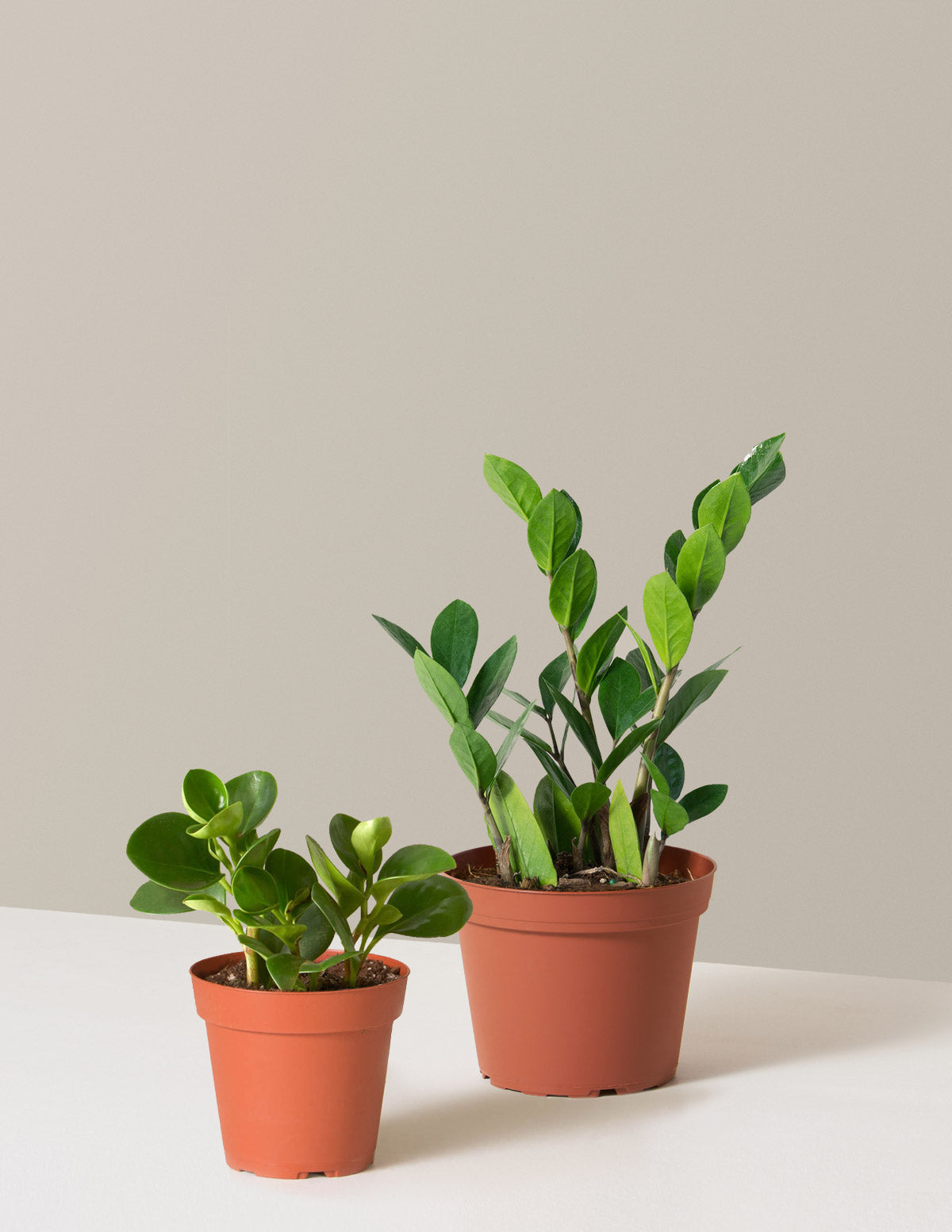 This low-maintenance duo is fit for the budding plant parent. The pet-friendly Peperomia Obtusifolia is robust and resilient, while the ZZ Plant is both drought and low-light tolerant.