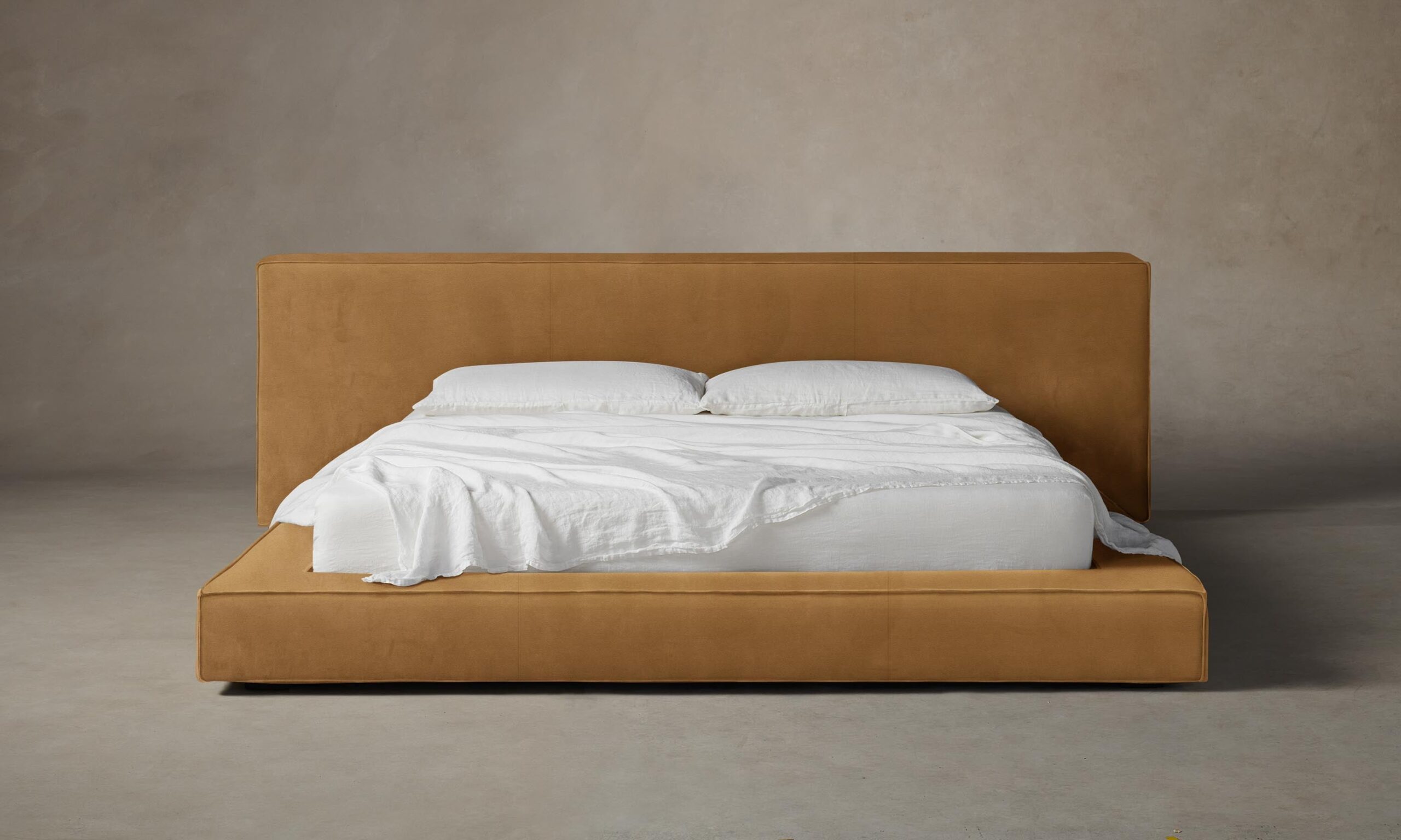 The Eldridge bed establishes a laid-back ambience in the bedroom with its low-lying silhouette and generous proportions. Fully upholstered and cushioned all around, it has an extended headboard and linear form traced with flange seams.