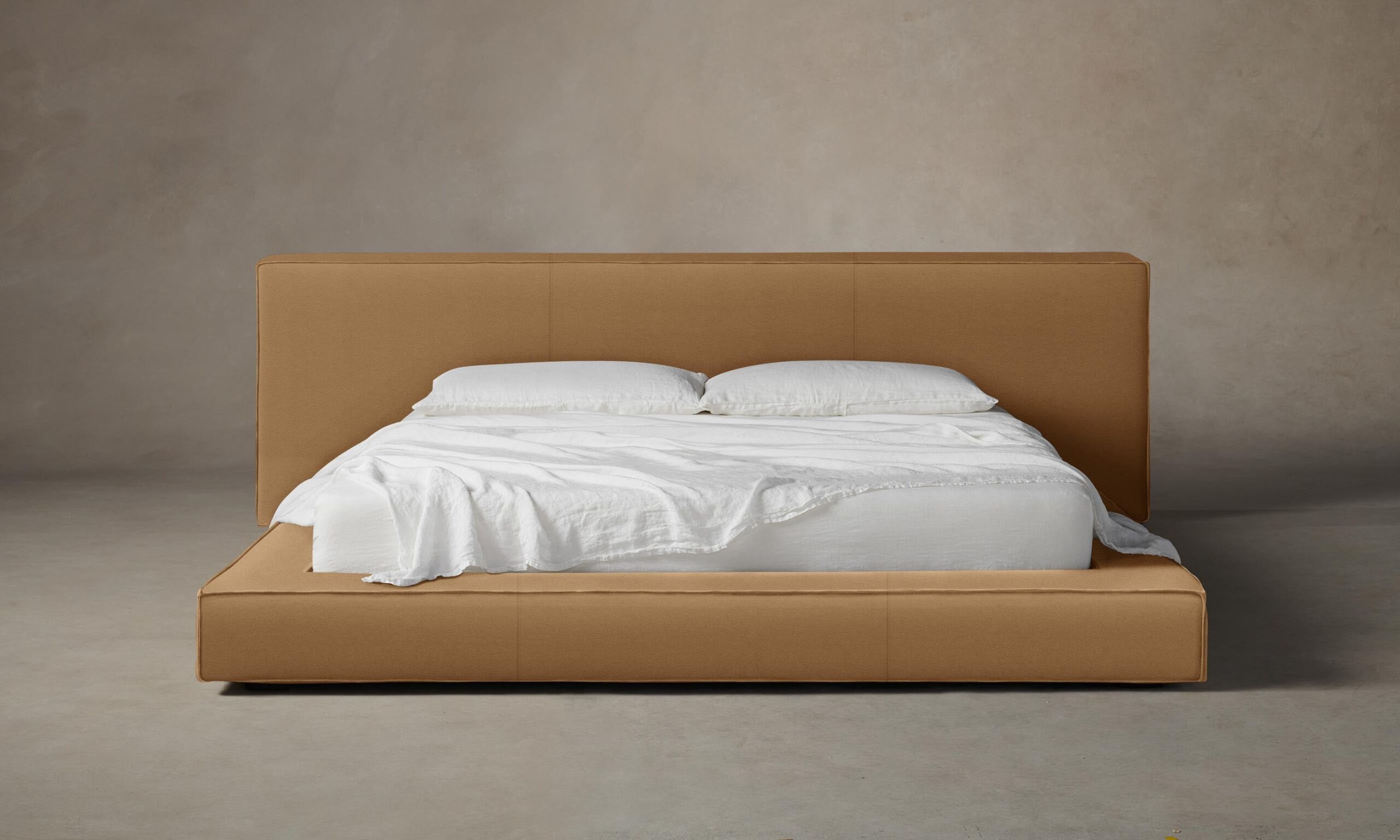 The Eldridge bed establishes a laid-back ambience in the bedroom with its low-lying silhouette and generous proportions. Fully upholstered and cushioned all around, it has an extended headboard and linear form traced with flange seams.