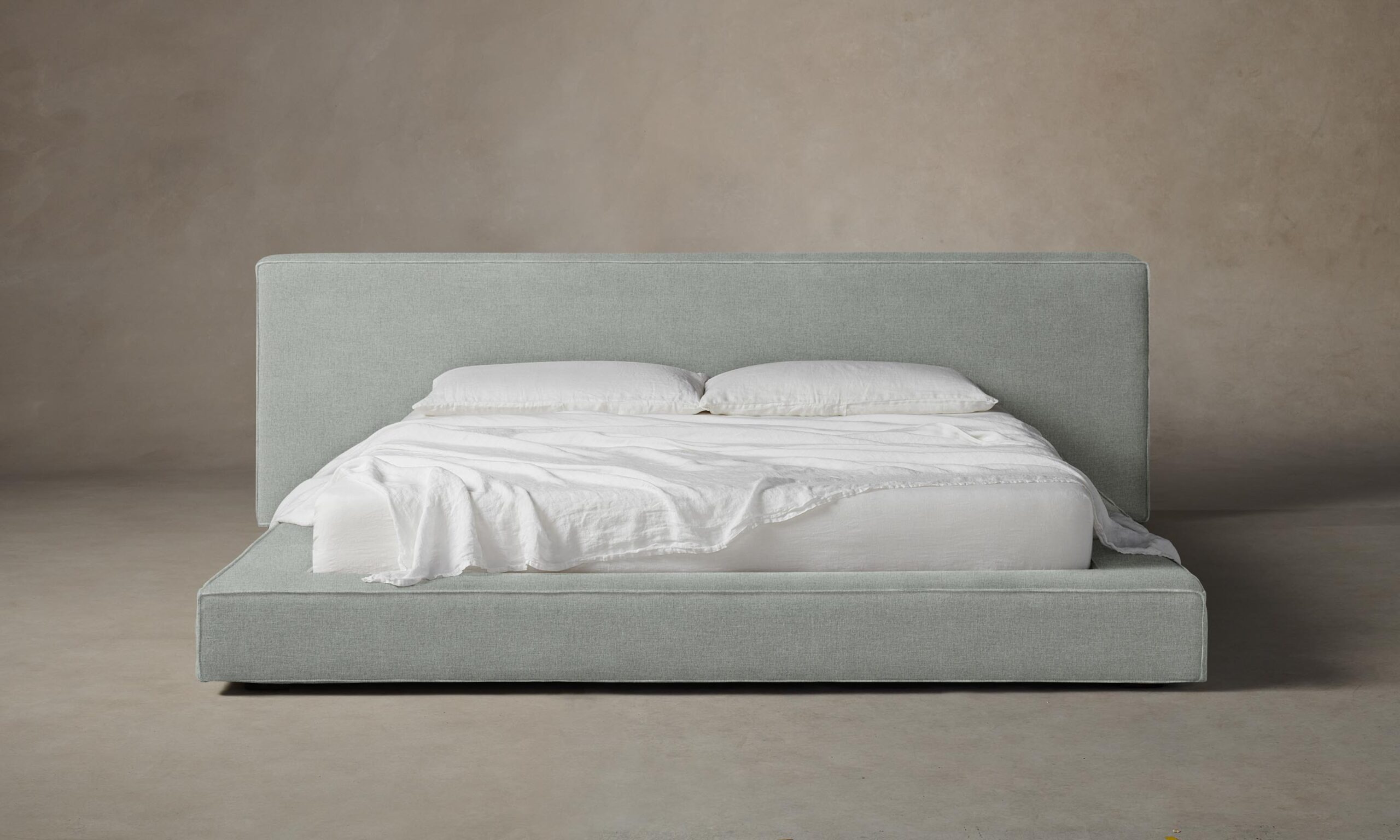 The Eldridge bed establishes a laid-back ambience in the bedroom with its low-lying silhouette and generous proportions. Fully upholstered and cushioned all around, it has an extended headboard and linear form traced with flange seams.