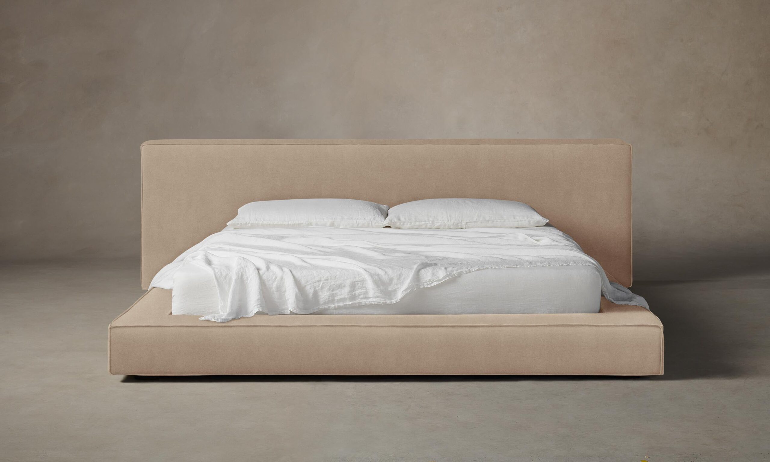 The Eldridge bed establishes a laid-back ambience in the bedroom with its low-lying silhouette and generous proportions. Fully upholstered and cushioned all around, it has an extended headboard and linear form traced with flange seams.