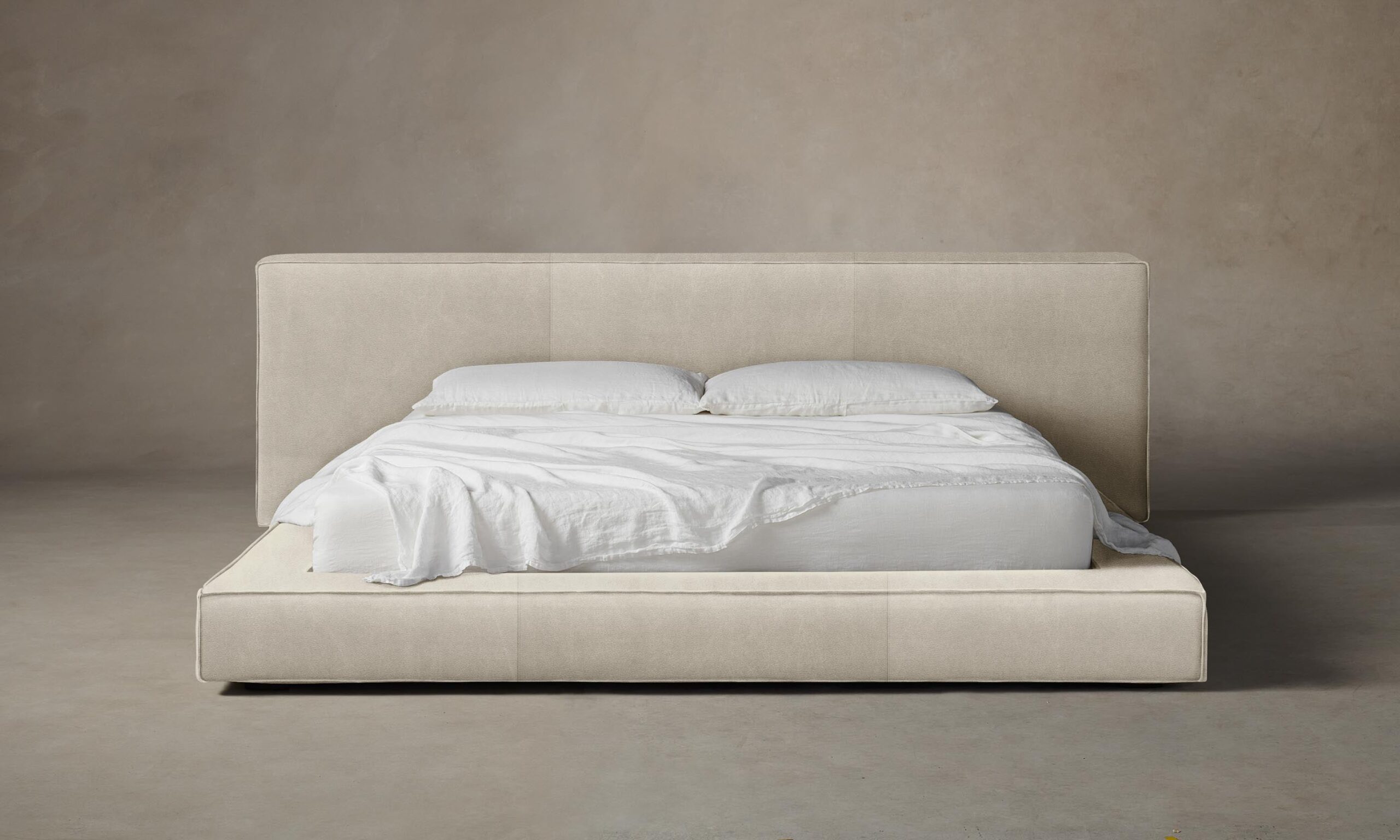The Eldridge bed establishes a laid-back ambience in the bedroom with its low-lying silhouette and generous proportions. Fully upholstered and cushioned all around, it has an extended headboard and linear form traced with flange seams.