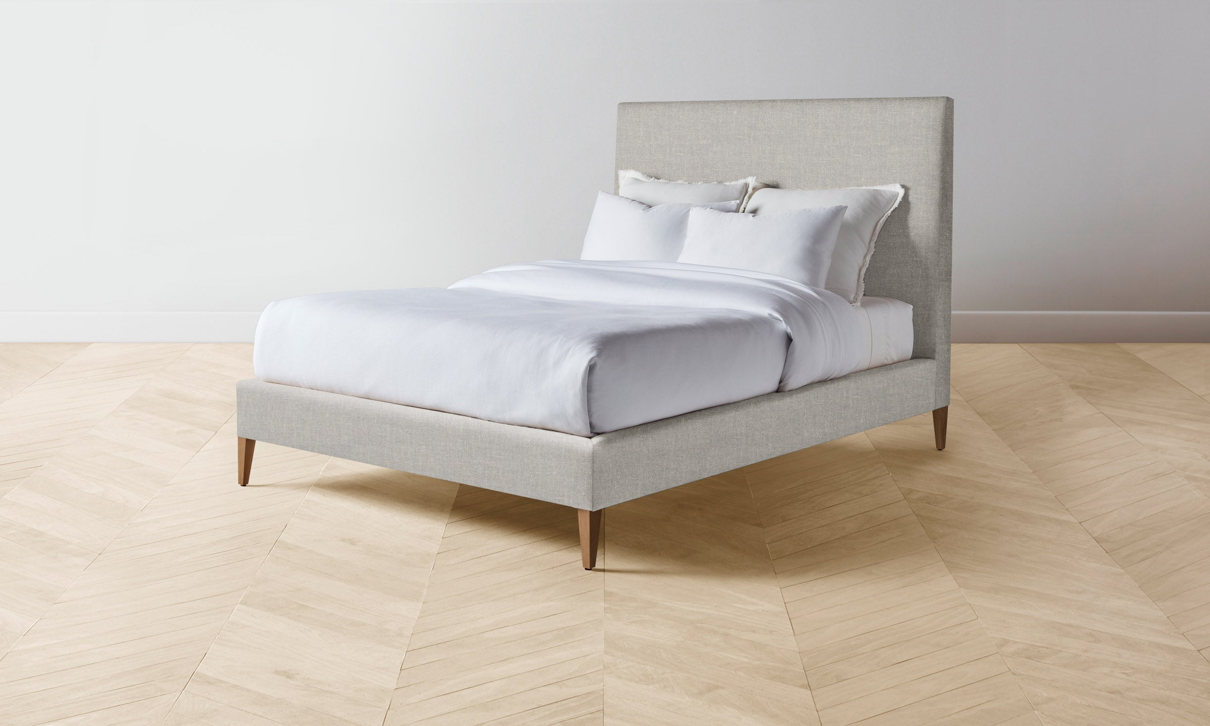 With its clean lines and neat tailoring, the Essex bed is timeless in the truest sense. It has a fully upholstered frame with mitered corners and rests upon elegantly tapered legs.