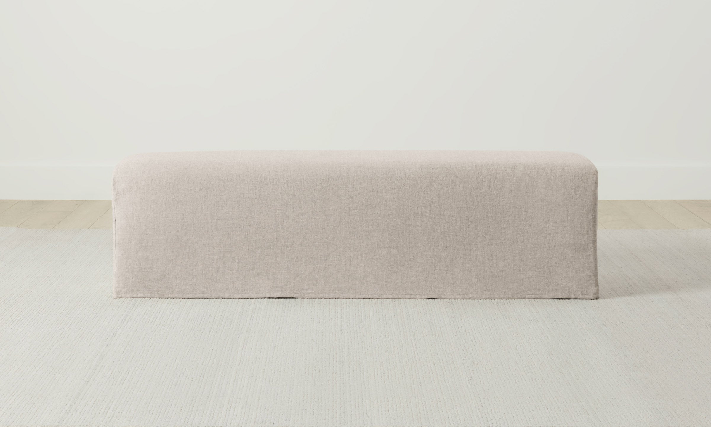 The Franklin bench is distinguished by its simplicity. It has an understated silhouette with a cushioned seat and hand-sewn slipcover that drapes softly to the floor.