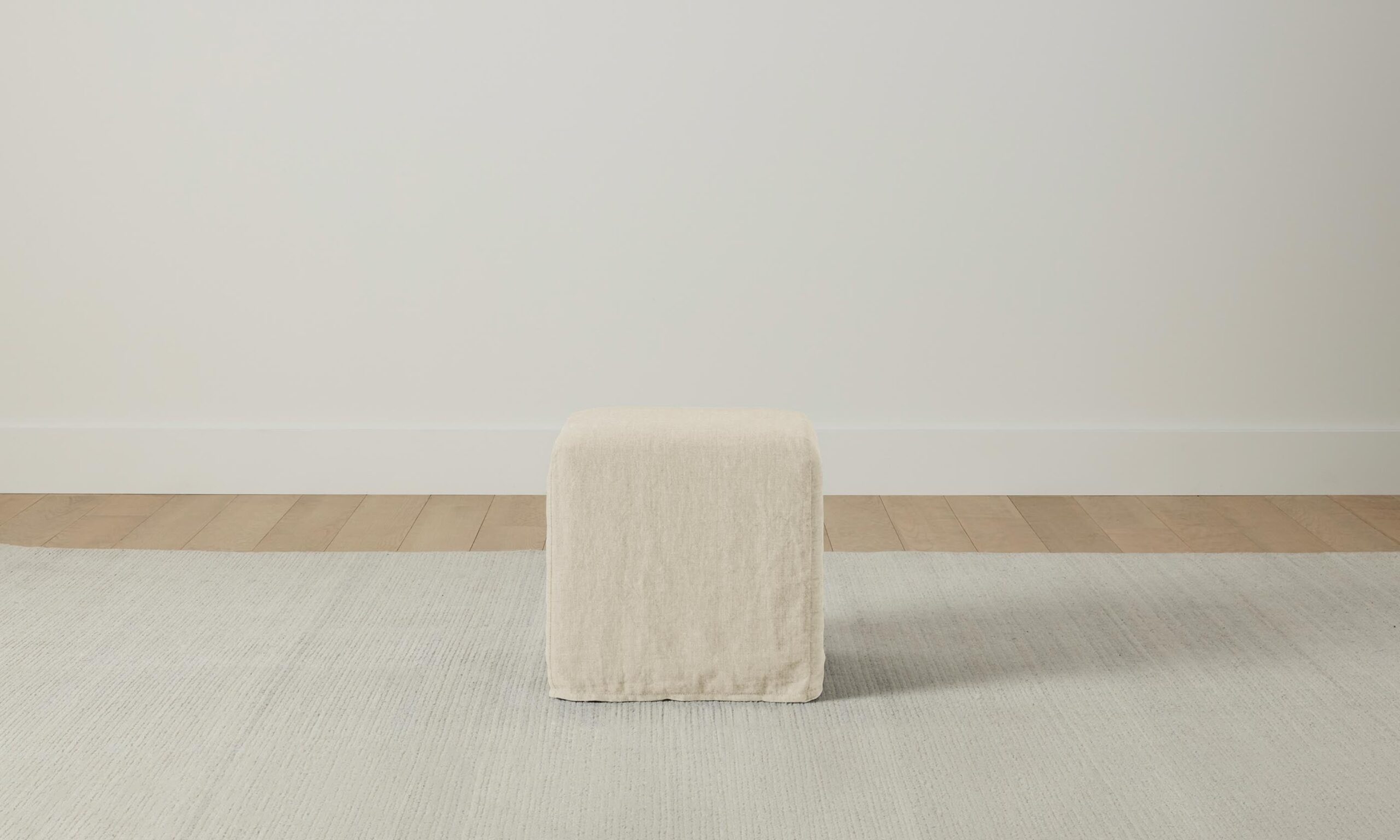 The Franklin ottoman is distinguished by its simplicity. It has an understated silhouette with a cushioned seat and hand-sewn slipcover that drapes softly to the floor.