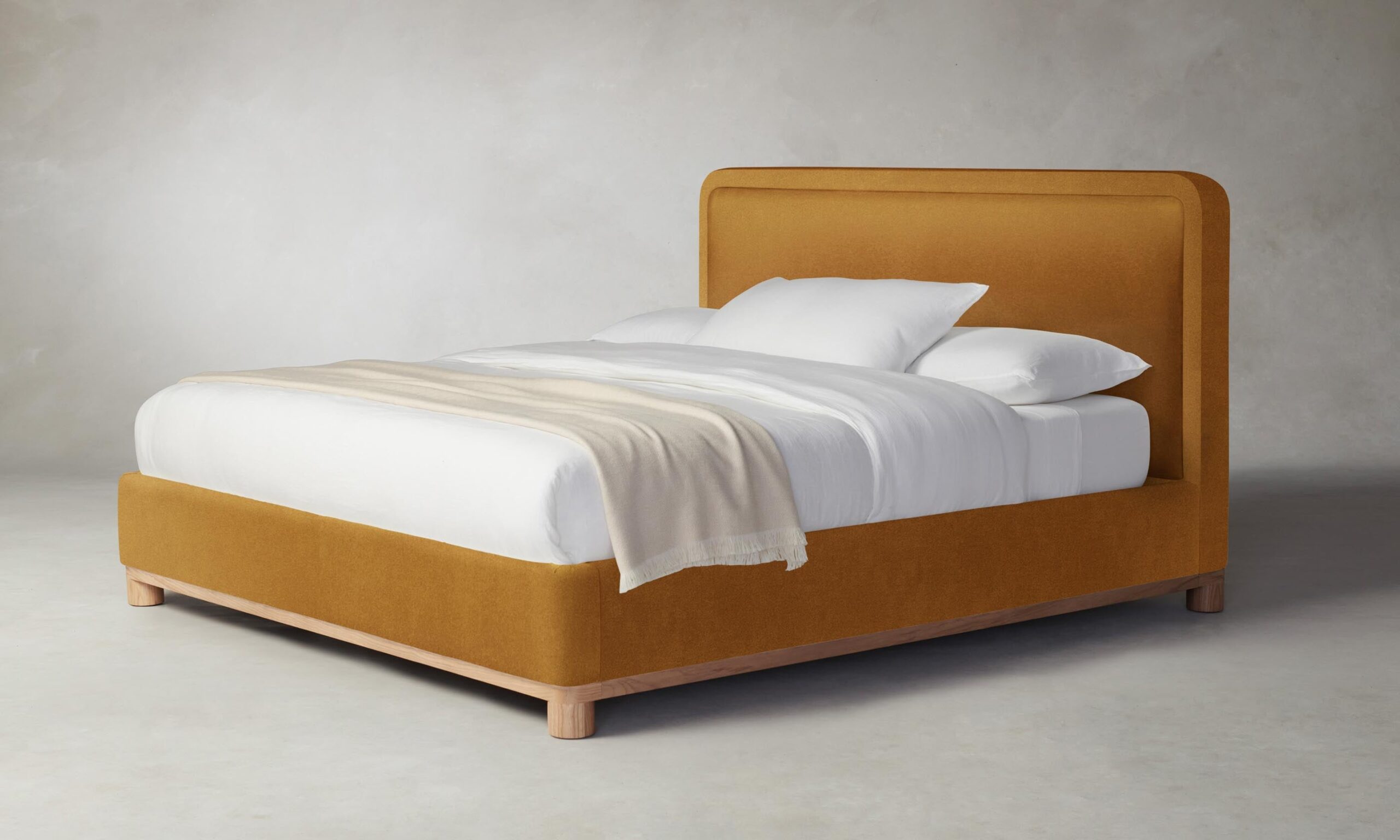 The Kent bed’s rounded geometries create a sense of softness and tranquility. The design is tightly upholstered to emphasize its curved corners and foot rail, and it sits atop a plinth base with lathe-turned legs.