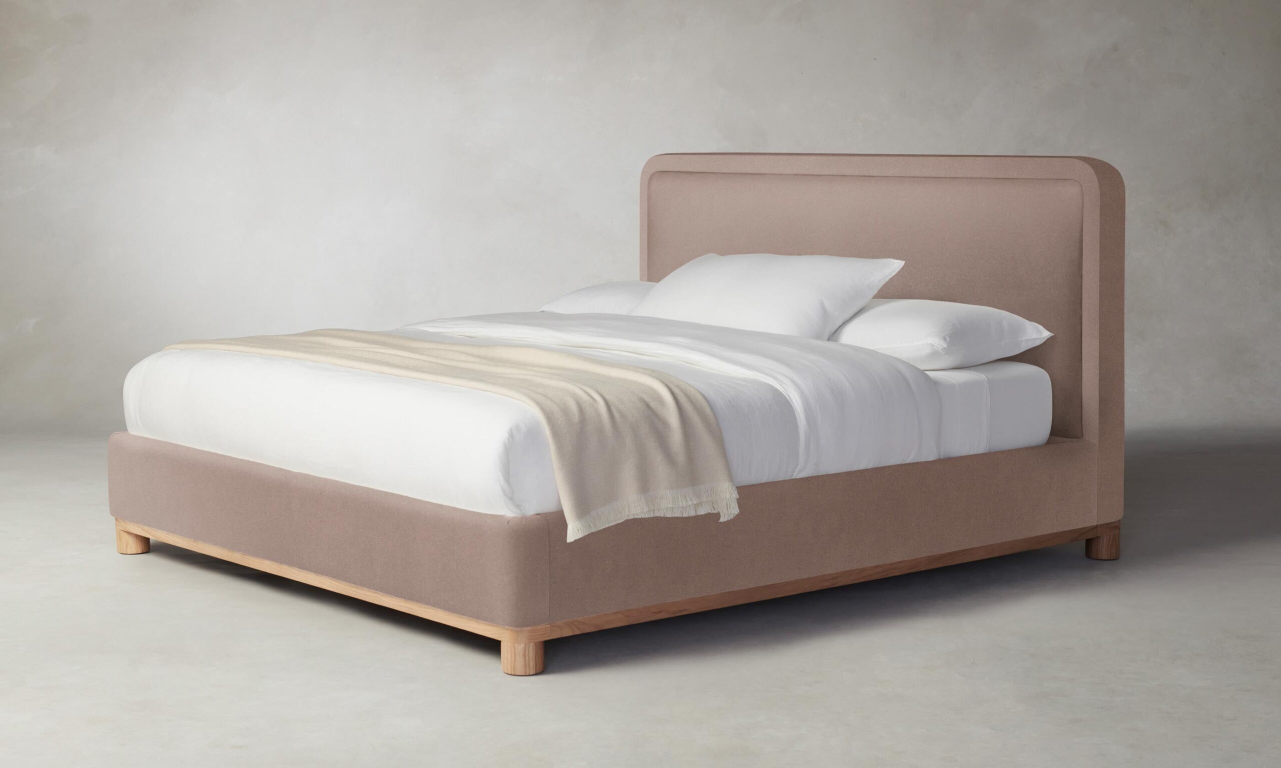 The Kent bed’s rounded geometries create a sense of softness and tranquility. The design is tightly upholstered to emphasize its curved corners and foot rail, and it sits atop a plinth base with lathe-turned legs.