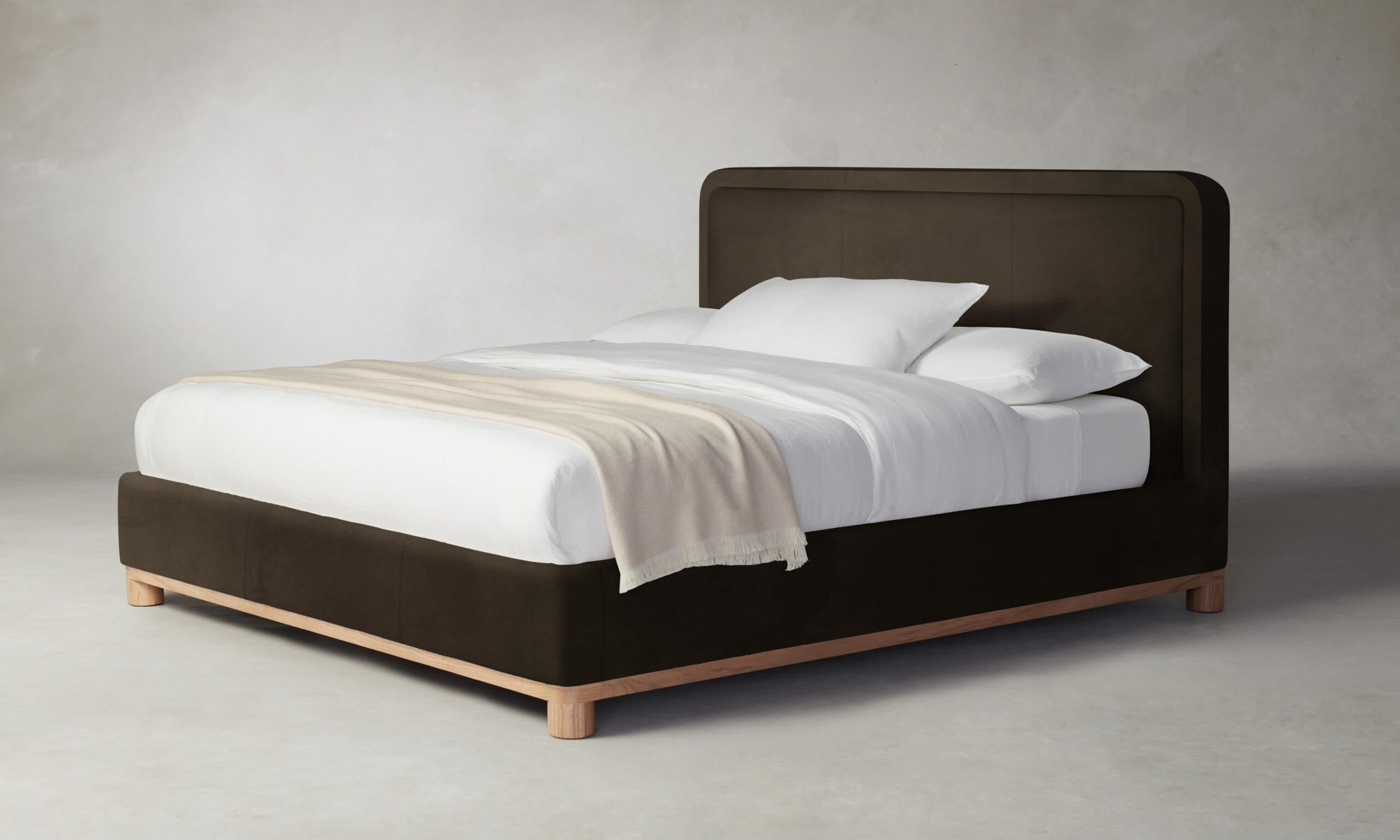 The Kent bed’s rounded geometries create a sense of softness and tranquility. The design is tightly upholstered to emphasize its curved corners and foot rail, and it sits atop a plinth base with lathe-turned legs.