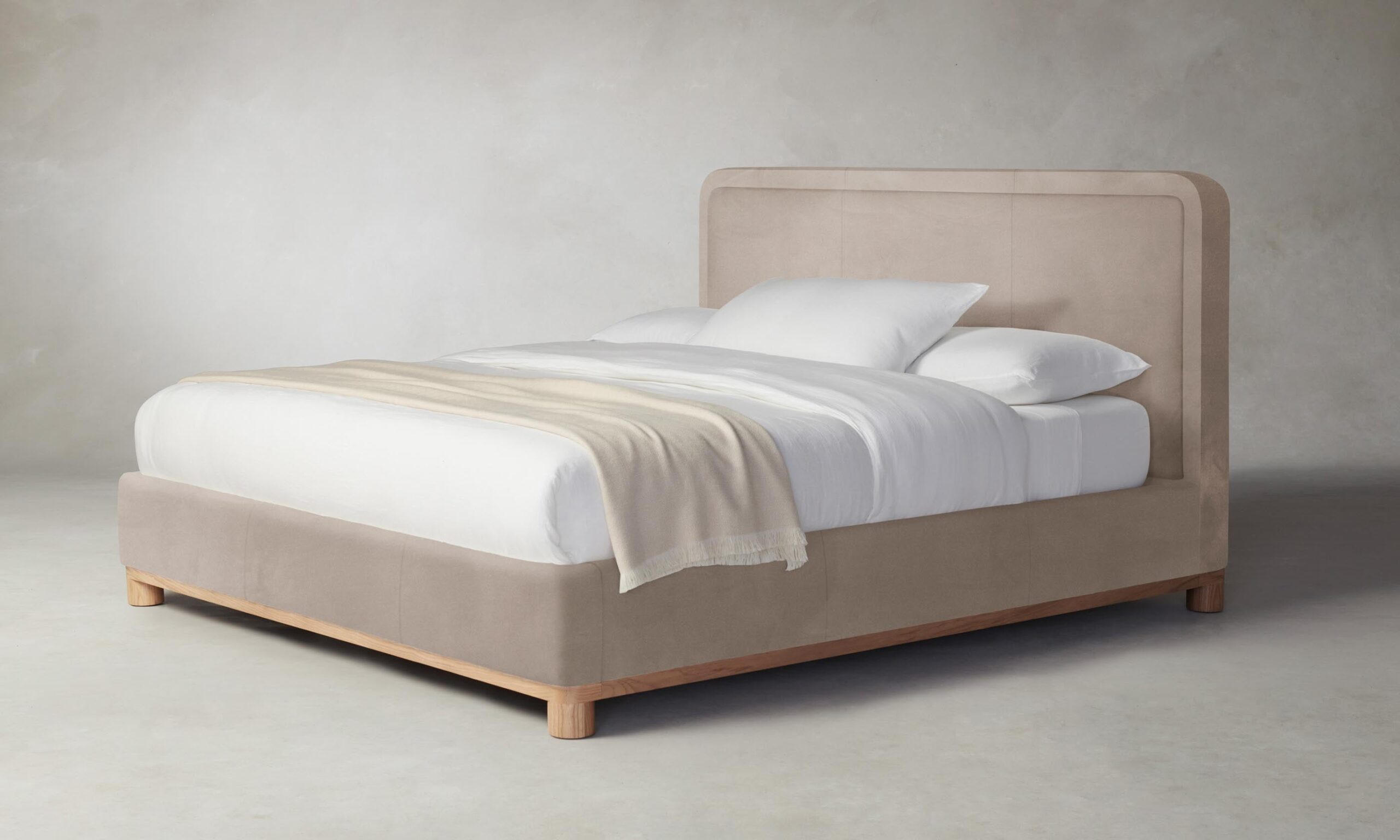 The Kent bed’s rounded geometries create a sense of softness and tranquility. The design is tightly upholstered to emphasize its curved corners and foot rail, and it sits atop a plinth base with lathe-turned legs.
