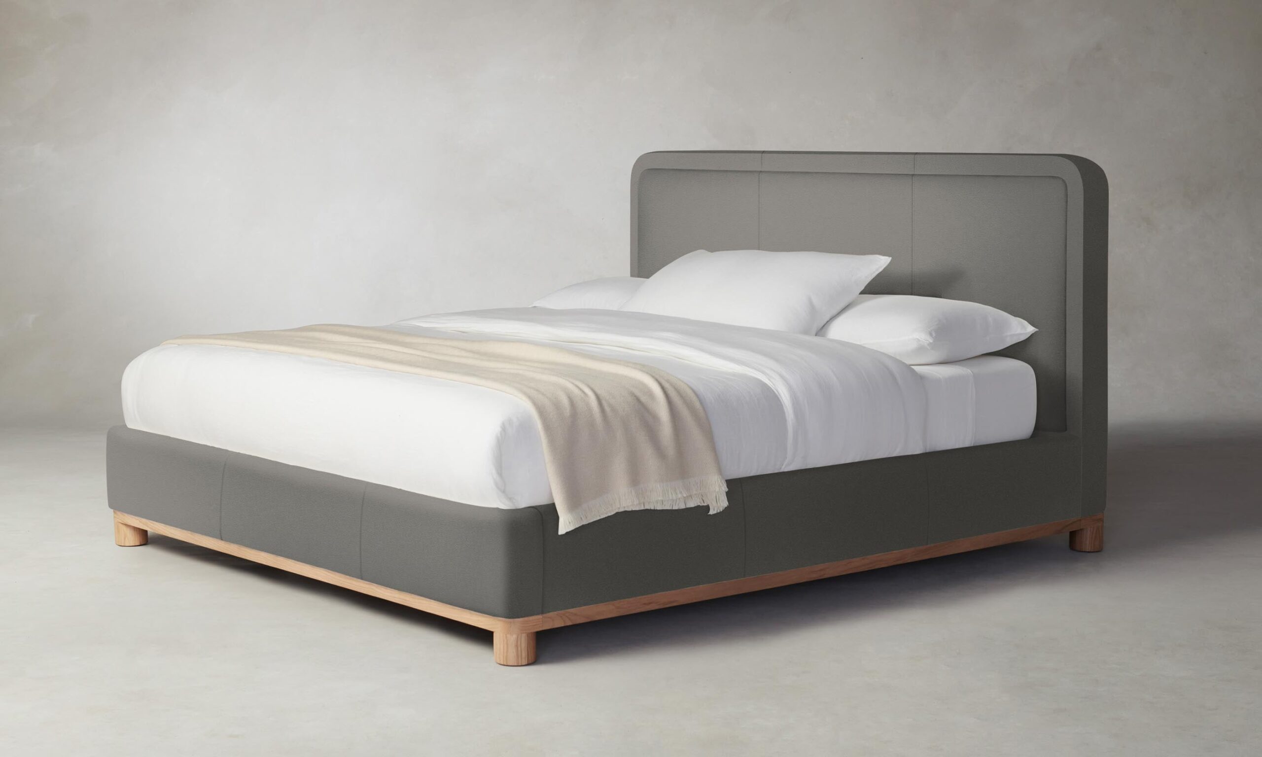 The Kent bed’s rounded geometries create a sense of softness and tranquility. The design is tightly upholstered to emphasize its curved corners and foot rail, and it sits atop a plinth base with lathe-turned legs.