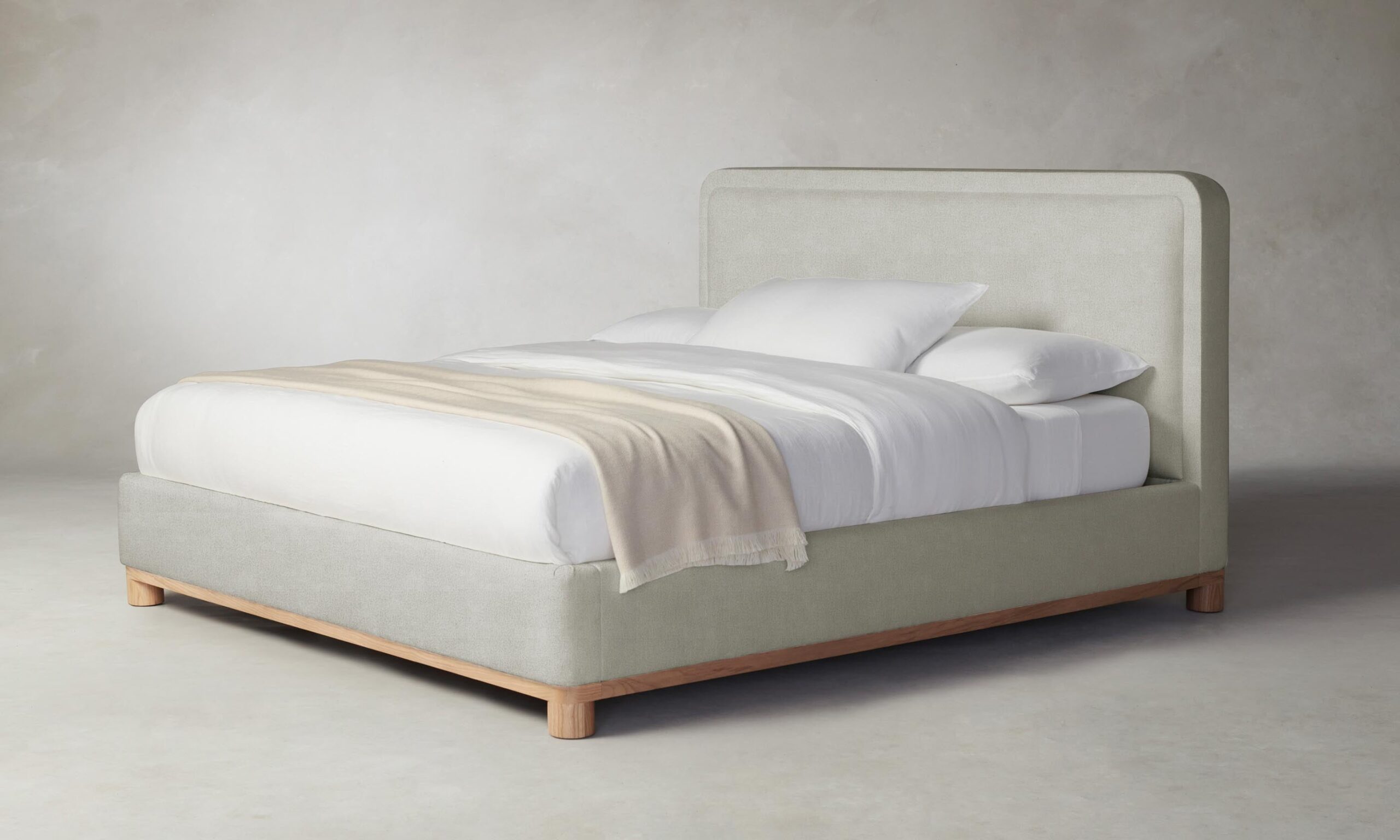 The Kent bed’s rounded geometries create a sense of softness and tranquility. The design is tightly upholstered to emphasize its curved corners and foot rail, and it sits atop a plinth base with lathe-turned legs.