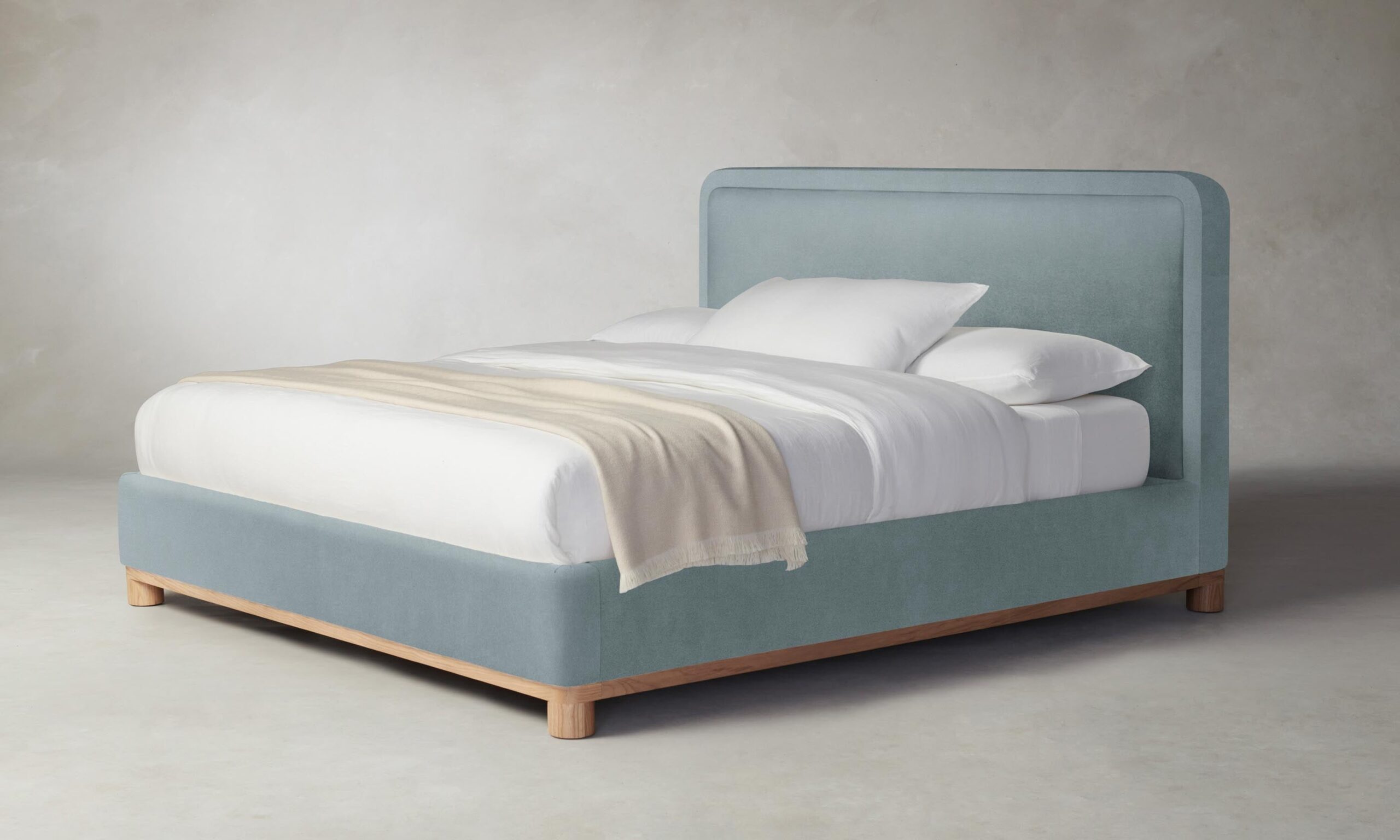 The Kent bed’s rounded geometries create a sense of softness and tranquility. The design is tightly upholstered to emphasize its curved corners and foot rail, and it sits atop a plinth base with lathe-turned legs.