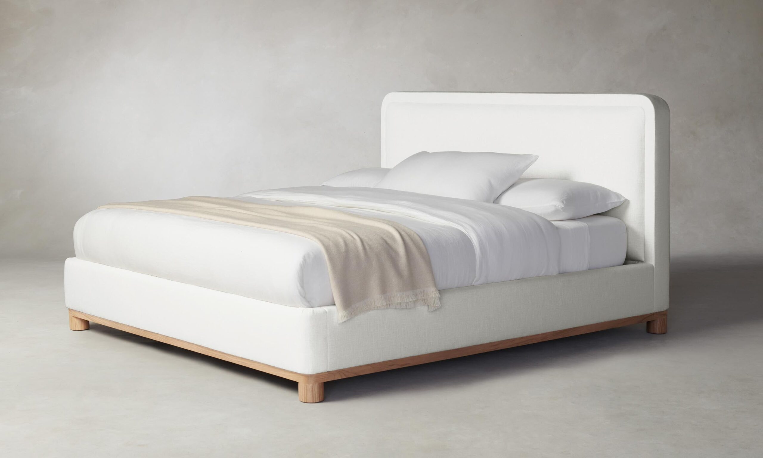 The Kent bed’s rounded geometries create a sense of softness and tranquility. The design is tightly upholstered to emphasize its curved corners and foot rail, and it sits atop a plinth base with lathe-turned legs.