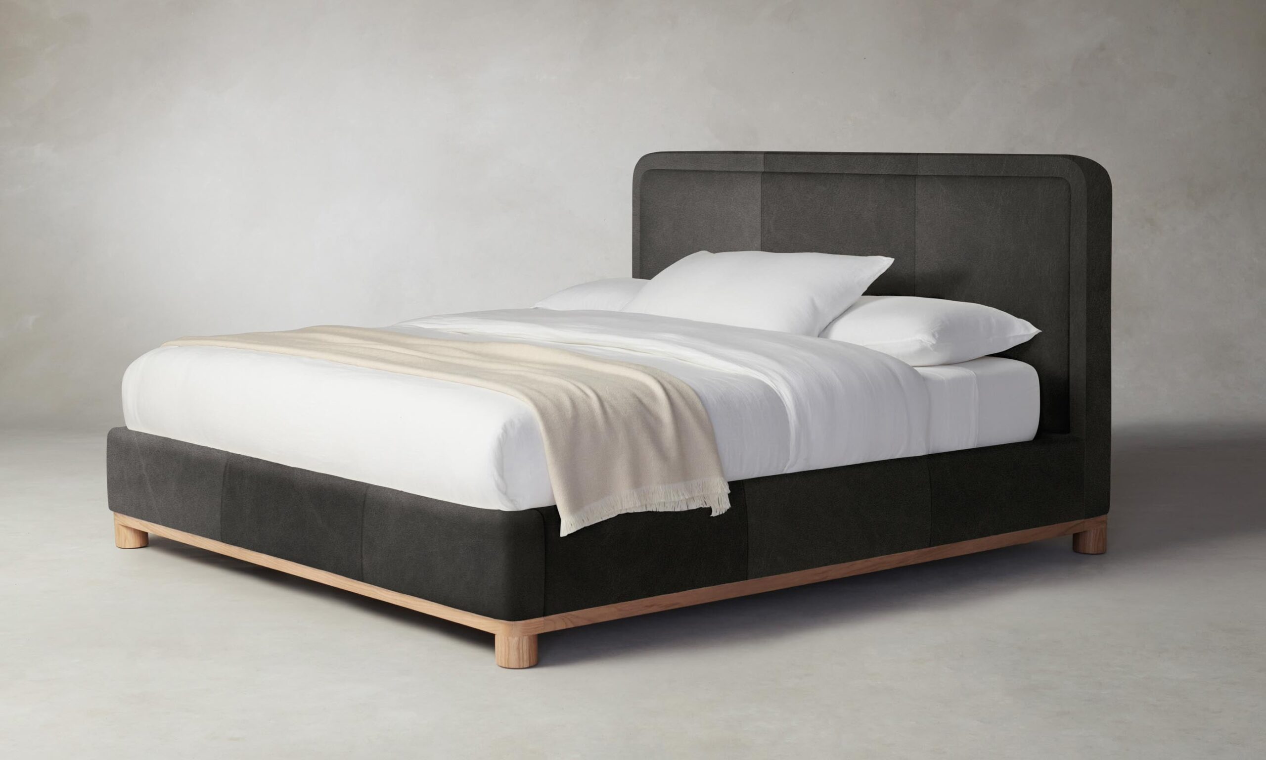 The Kent bed’s rounded geometries create a sense of softness and tranquility. The design is tightly upholstered to emphasize its curved corners and foot rail, and it sits atop a plinth base with lathe-turned legs.