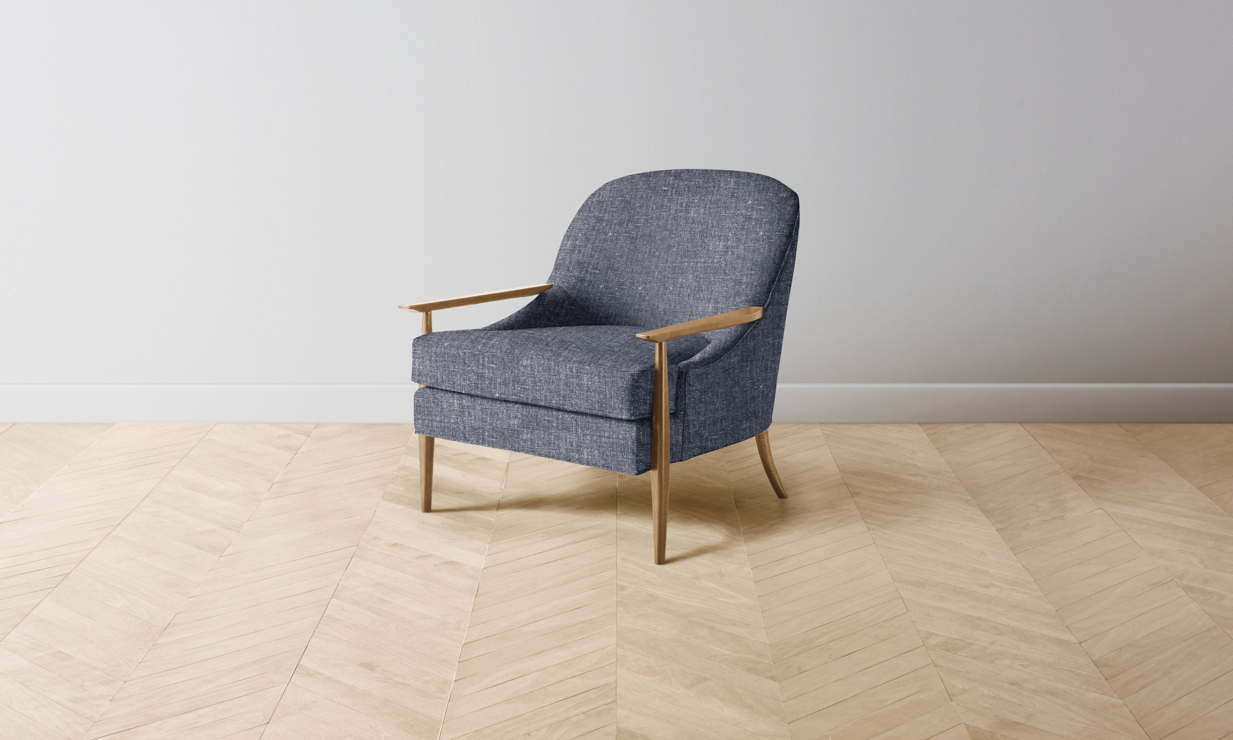 The Leroy chair carries the elegance of mid-century design into the home with its curved silhouette and tight upholstery. It features slender arms and legs that taper to the floor.