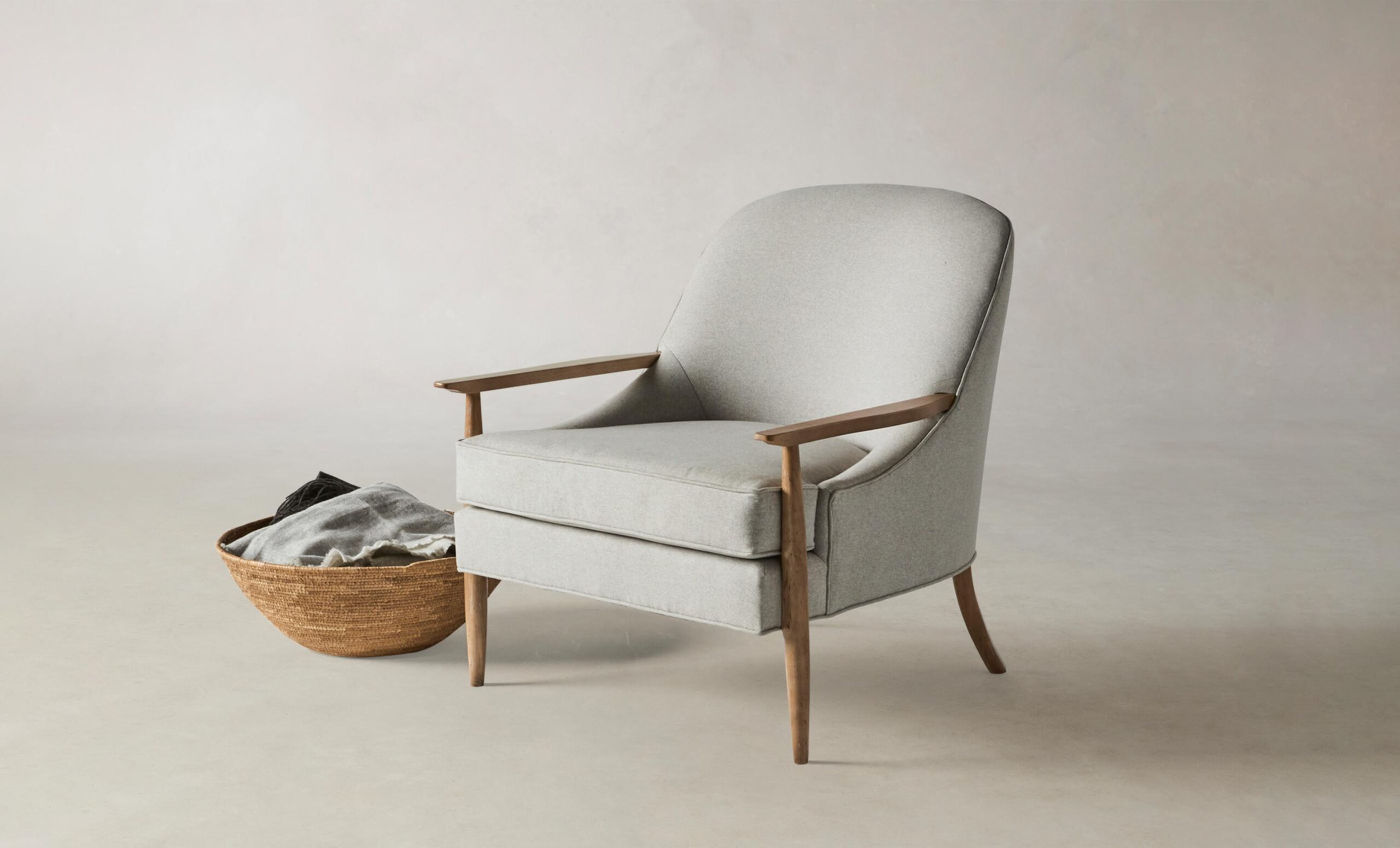 The Leroy chair carries the elegance of mid-century design into the home with its curved silhouette and tight upholstery. It features slender arms and legs that taper to the floor.