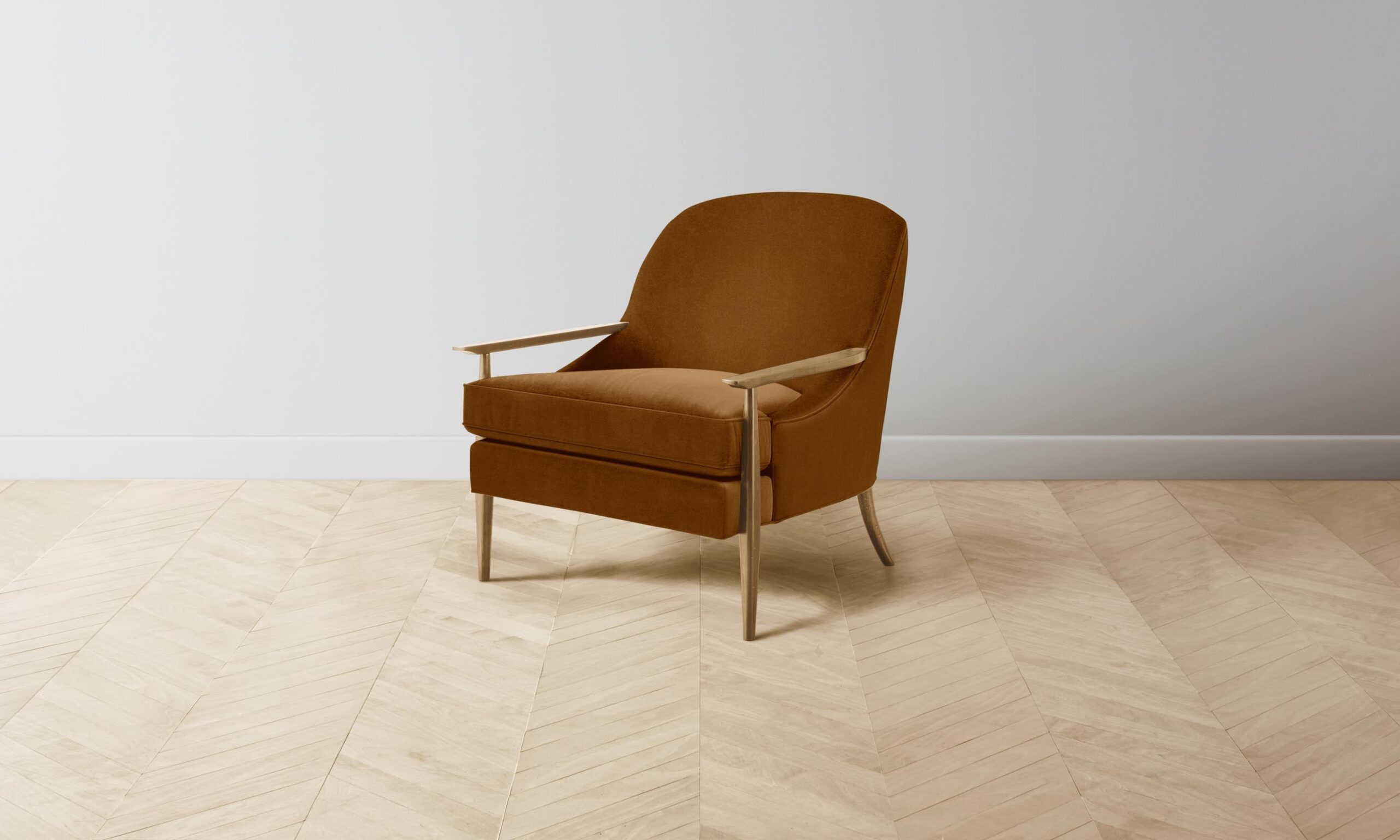 The Leroy chair carries the elegance of mid-century design into the home with its curved silhouette and tight upholstery. It features slender arms and legs that taper to the floor.