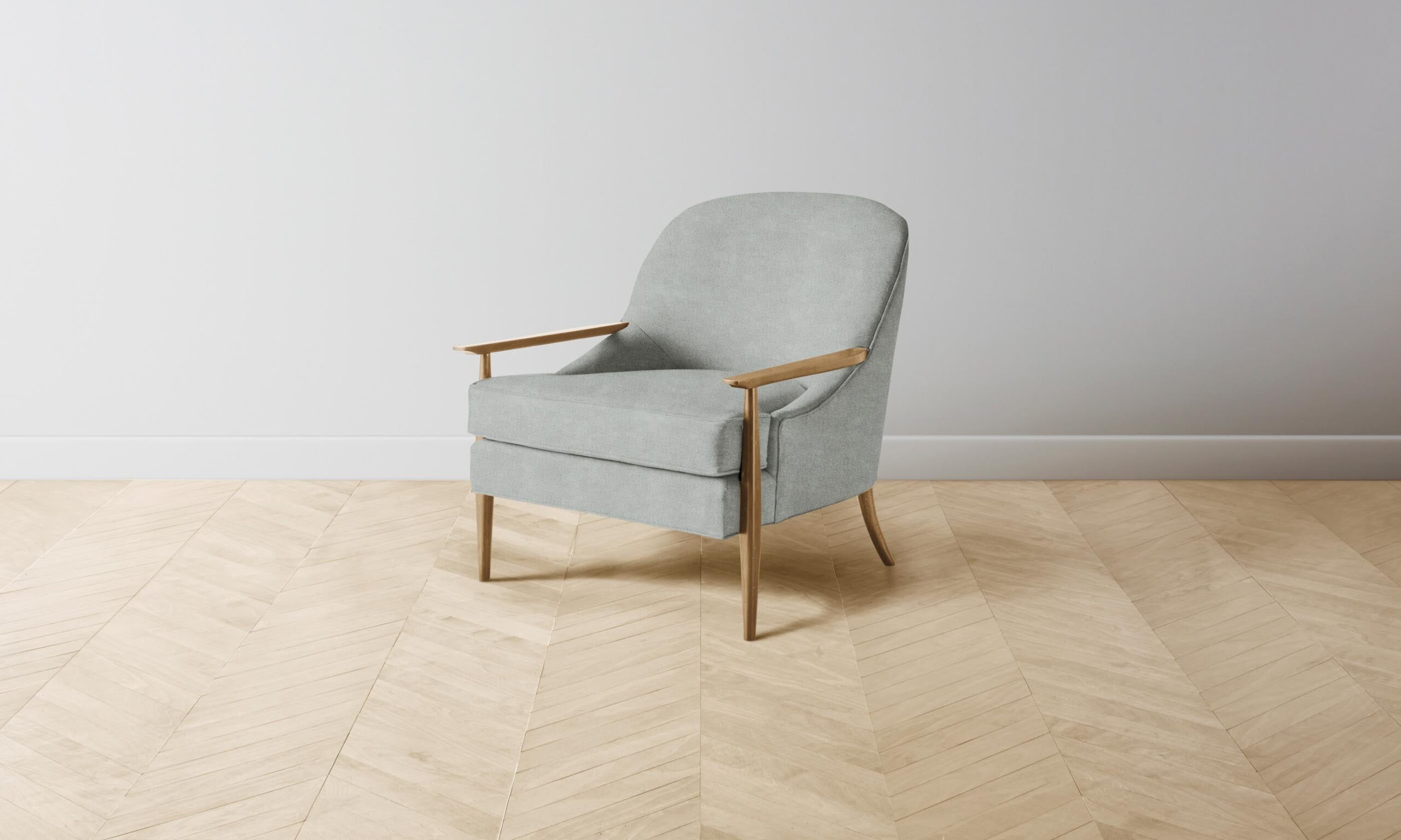 The Leroy chair carries the elegance of mid-century design into the home with its curved silhouette and tight upholstery. It features slender arms and legs that taper to the floor.