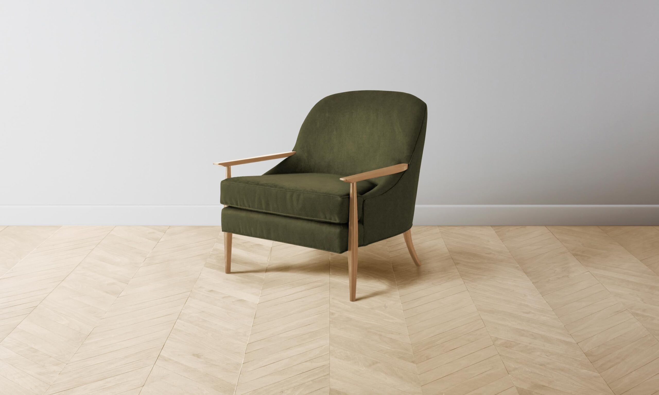The Leroy chair carries the elegance of mid-century design into the home with its curved silhouette and tight upholstery. It features slender arms and legs that taper to the floor.