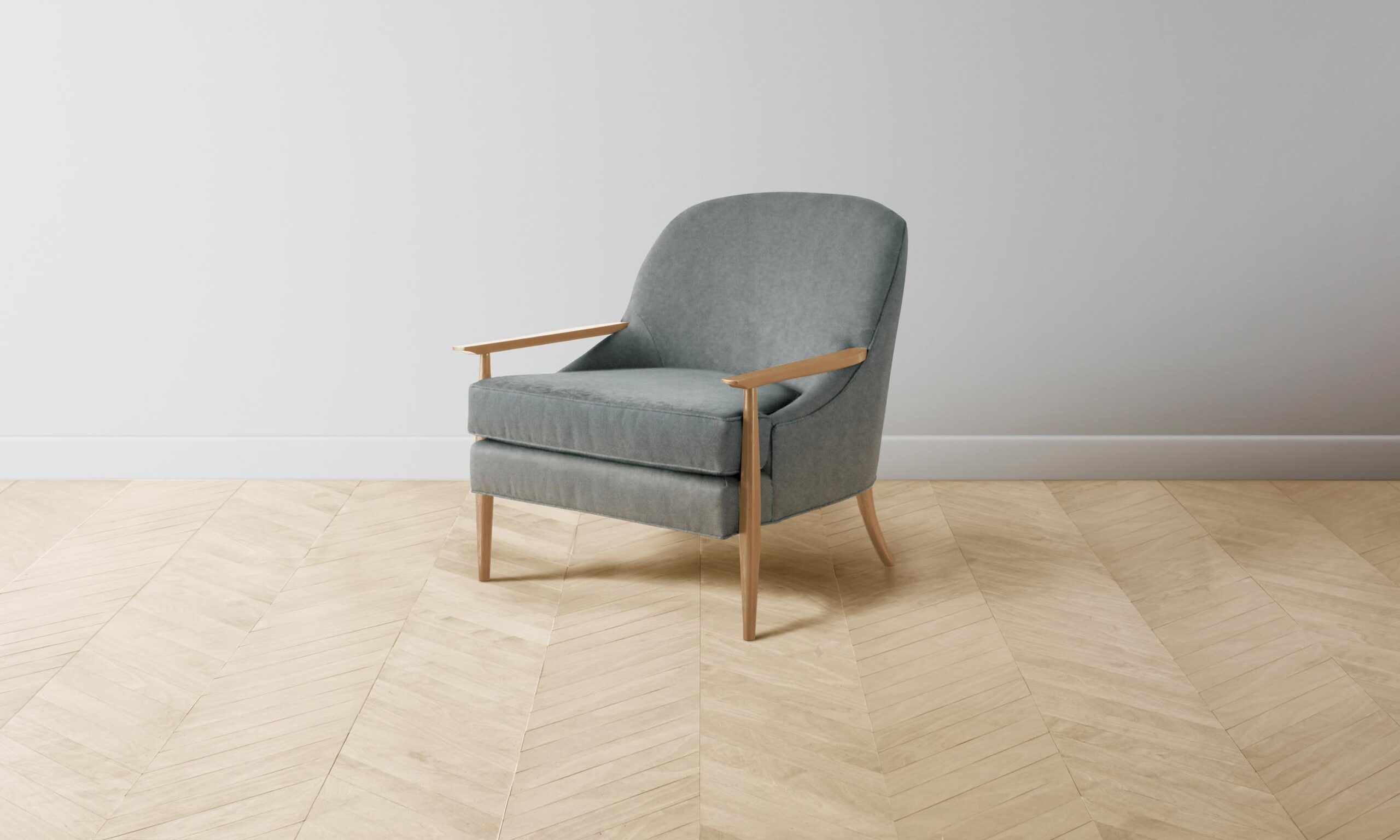 The Leroy chair carries the elegance of mid-century design into the home with its curved silhouette and tight upholstery. It features slender arms and legs that taper to the floor.