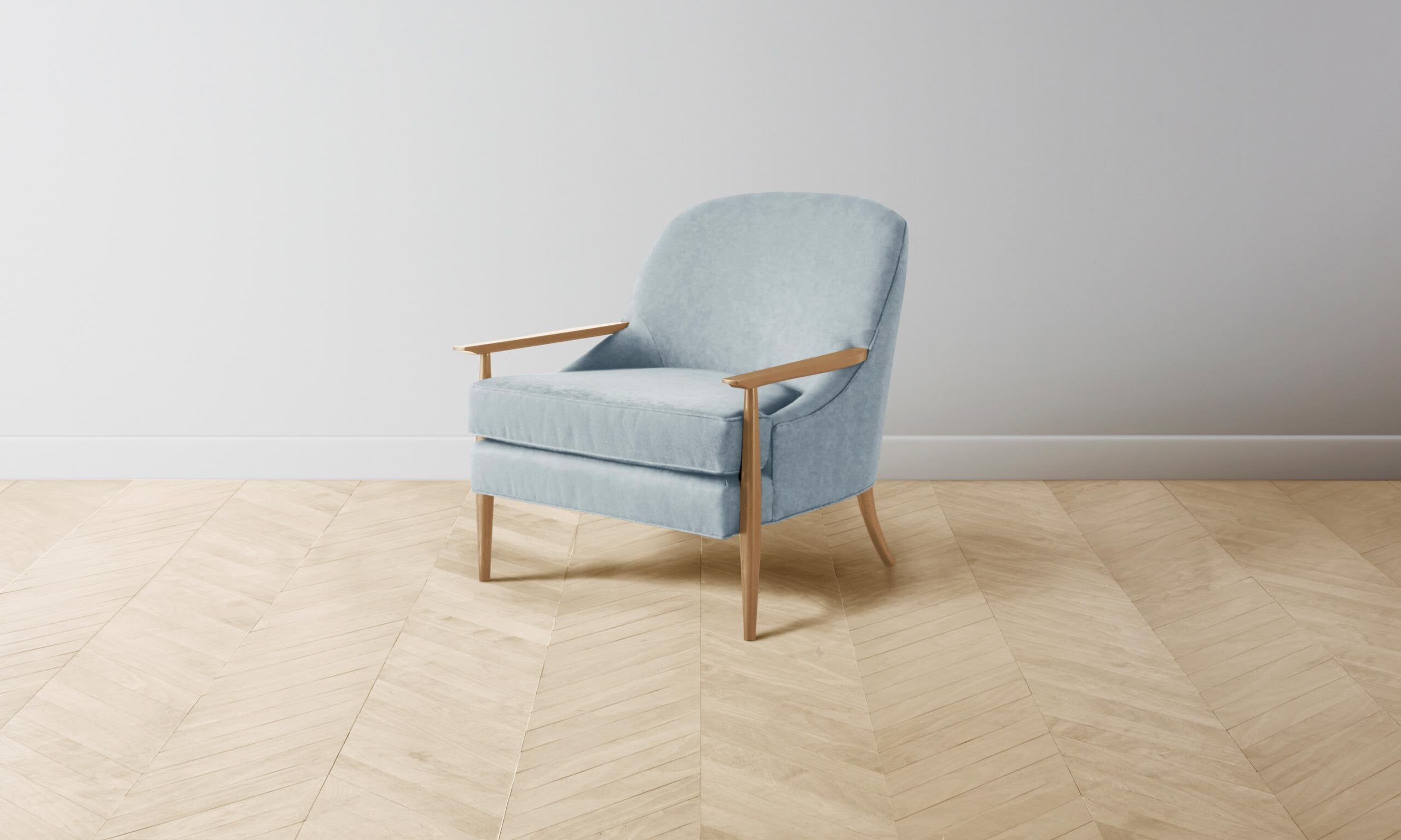 The Leroy chair carries the elegance of mid-century design into the home with its curved silhouette and tight upholstery. It features slender arms and legs that taper to the floor.