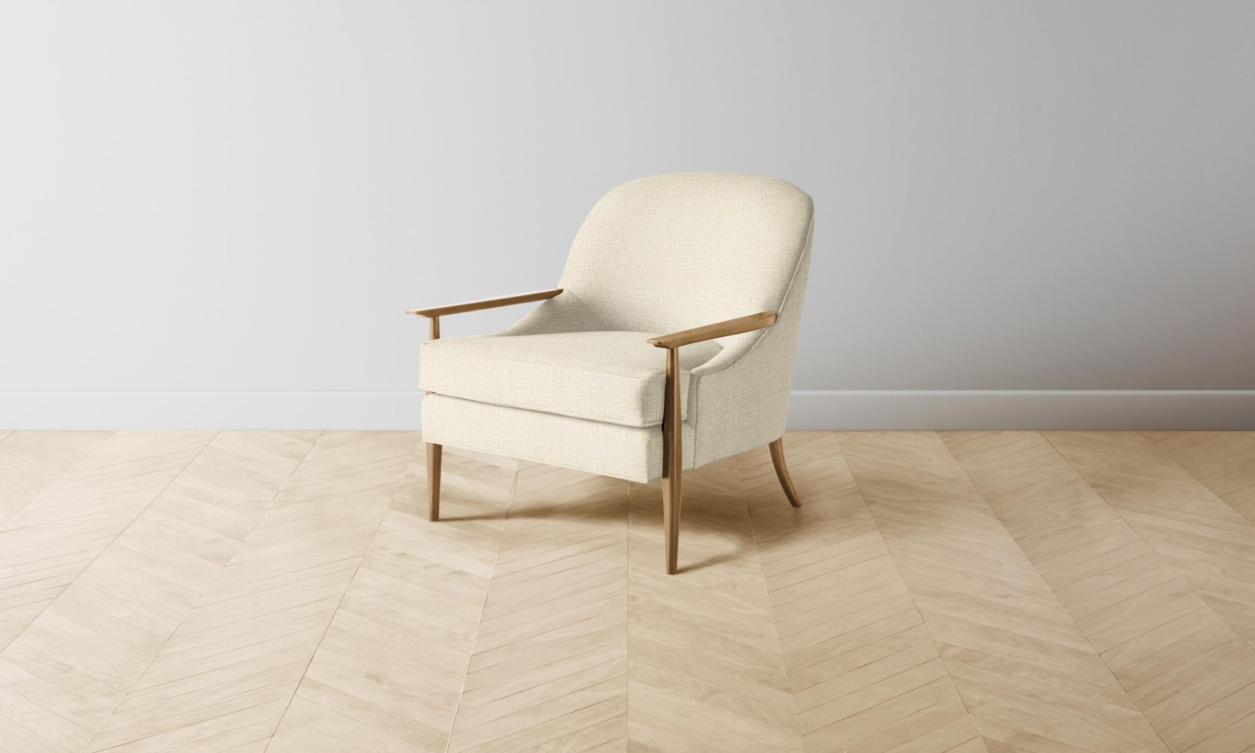 The Leroy chair carries the elegance of mid-century design into the home with its curved silhouette and tight upholstery. It features slender arms and legs that taper to the floor.