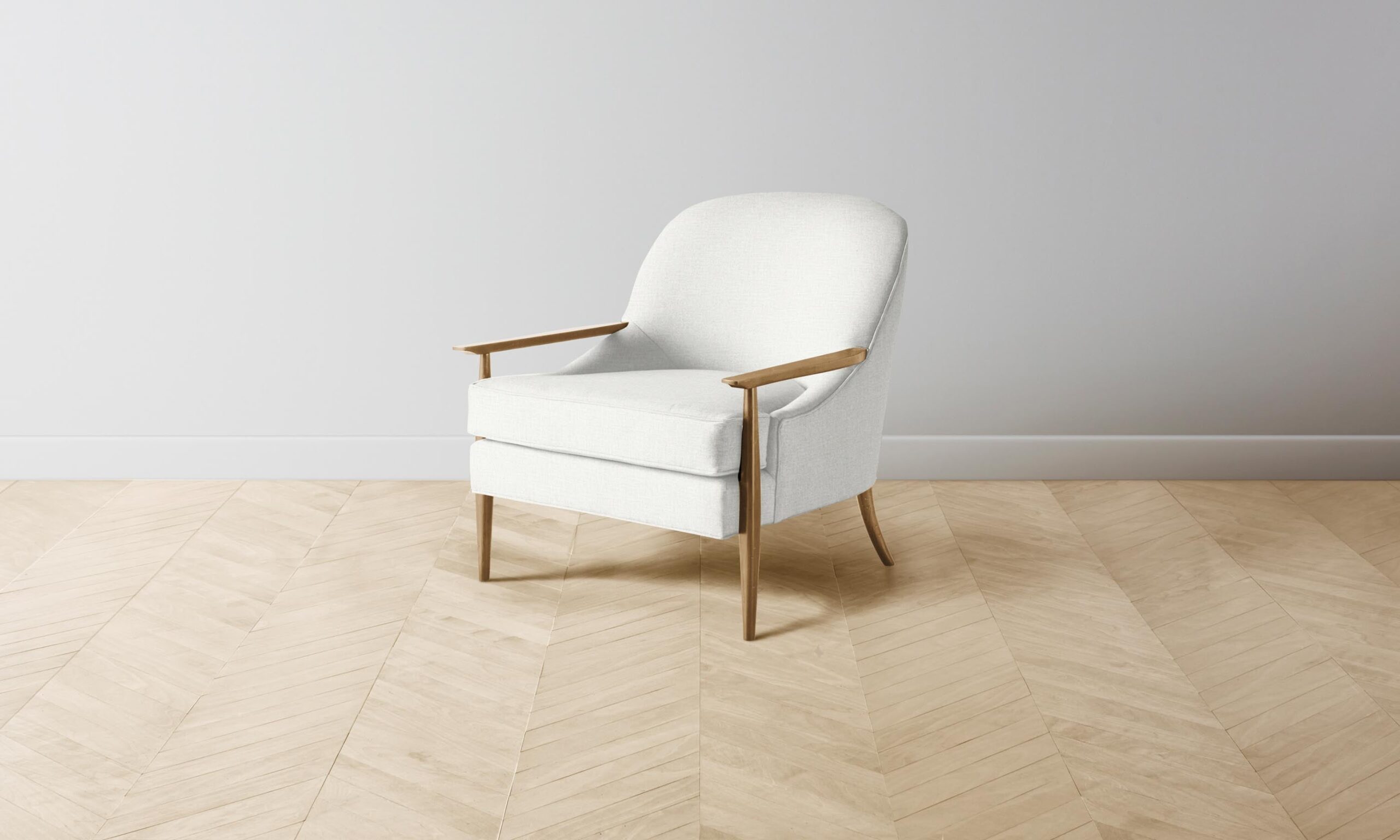 The Leroy chair carries the elegance of mid-century design into the home with its curved silhouette and tight upholstery. It features slender arms and legs that taper to the floor.