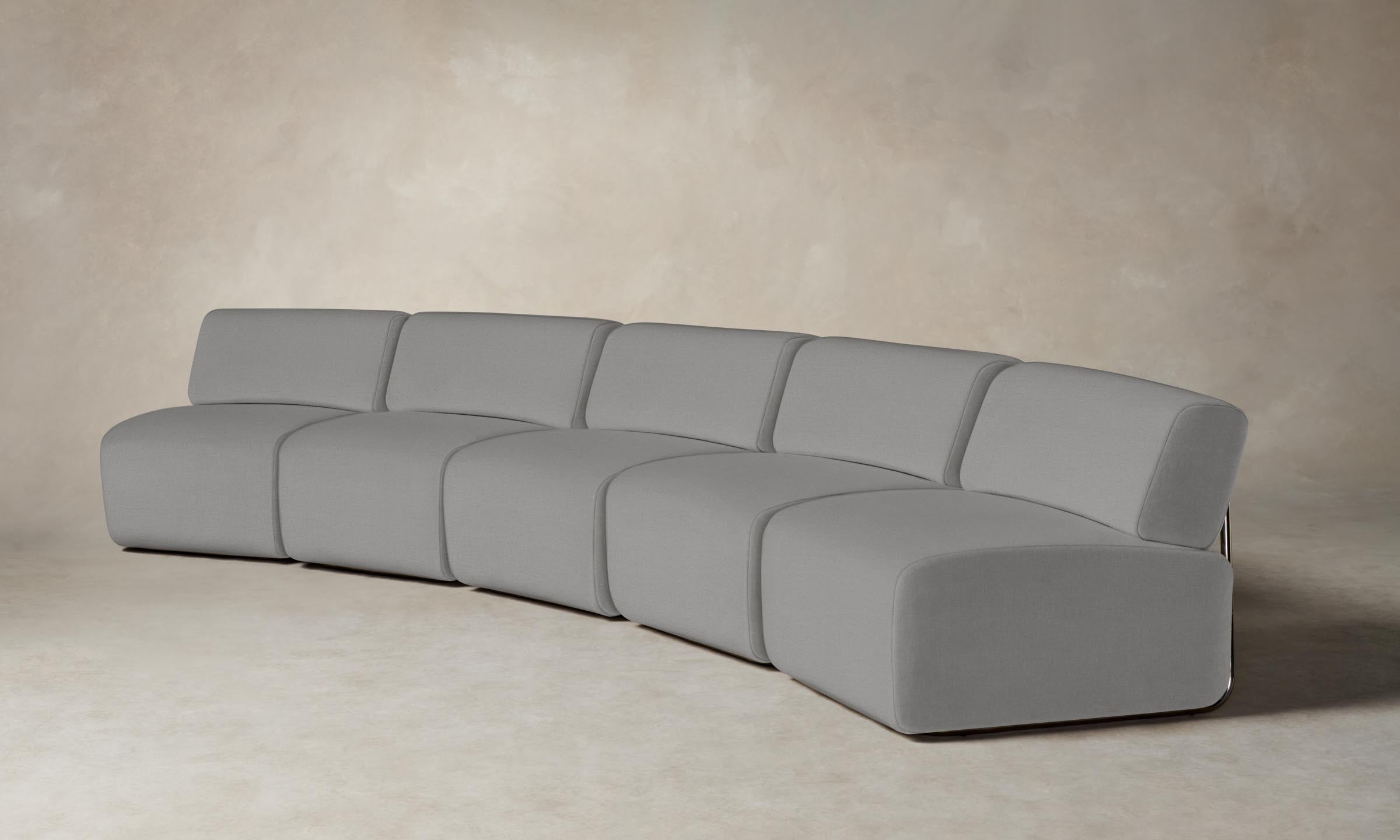 The Miles modular sectional is a bold articulation of modernist design influences. Resting upon a polished chrome frame, its voluminous seat cushions come together into a beautiful curved silhouette.