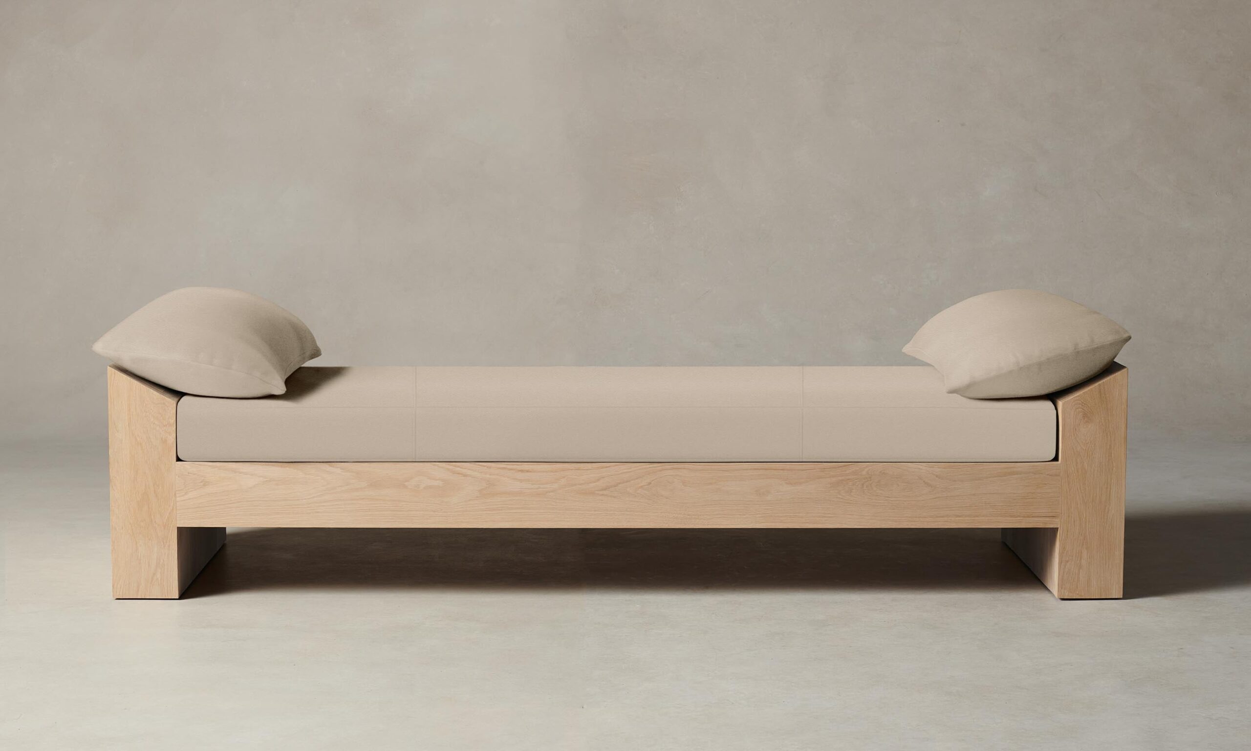 The Montauk daybed is a sanctuary for relaxation. Its low-lying frame cradles a plush cushion and soft pillows that invite a sense of serenity.