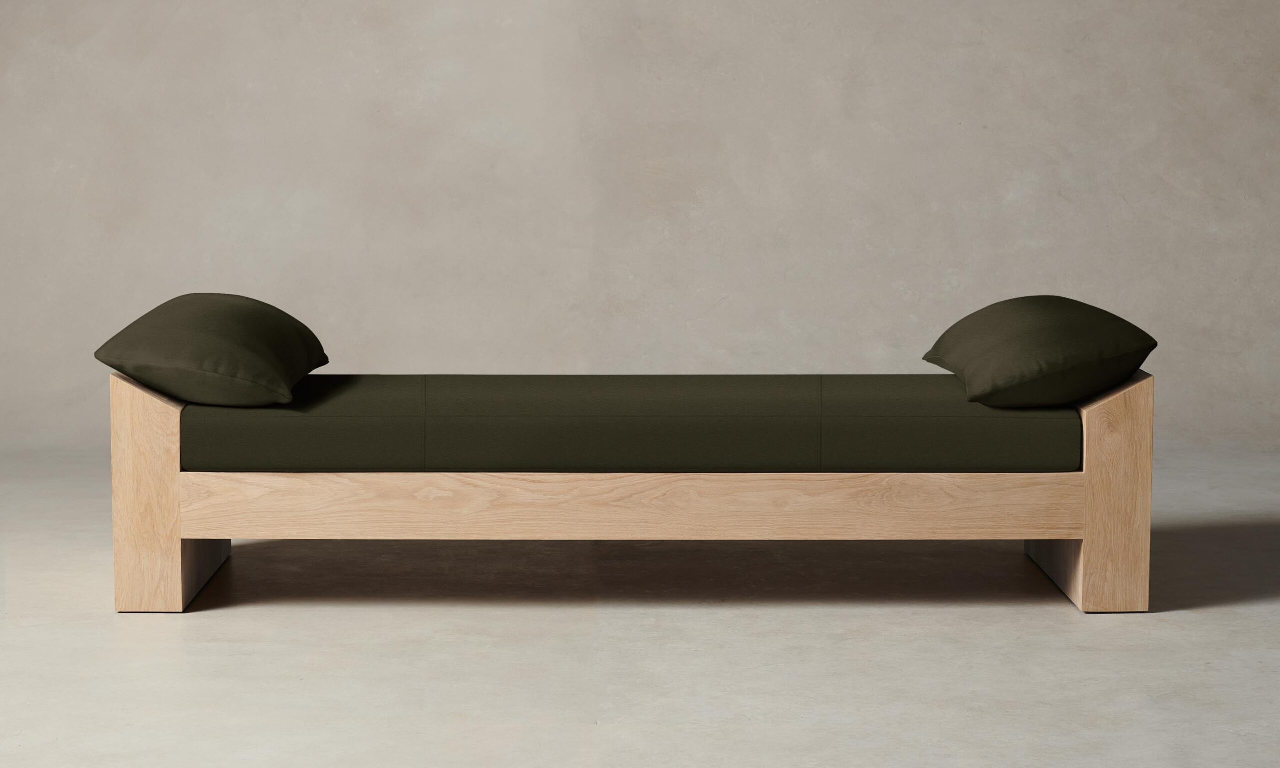 The Montauk daybed is a sanctuary for relaxation. Its low-lying frame cradles a plush cushion and soft pillows that invite a sense of serenity.