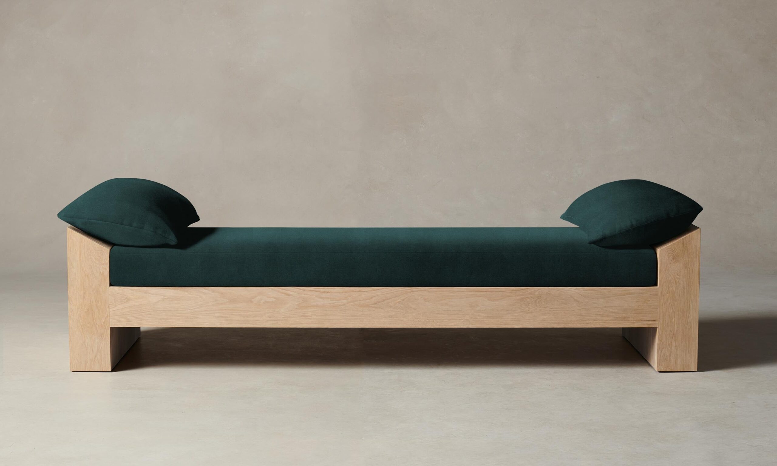 The Montauk daybed is a sanctuary for relaxation. Its low-lying frame cradles a plush cushion and soft pillows that invite a sense of serenity.