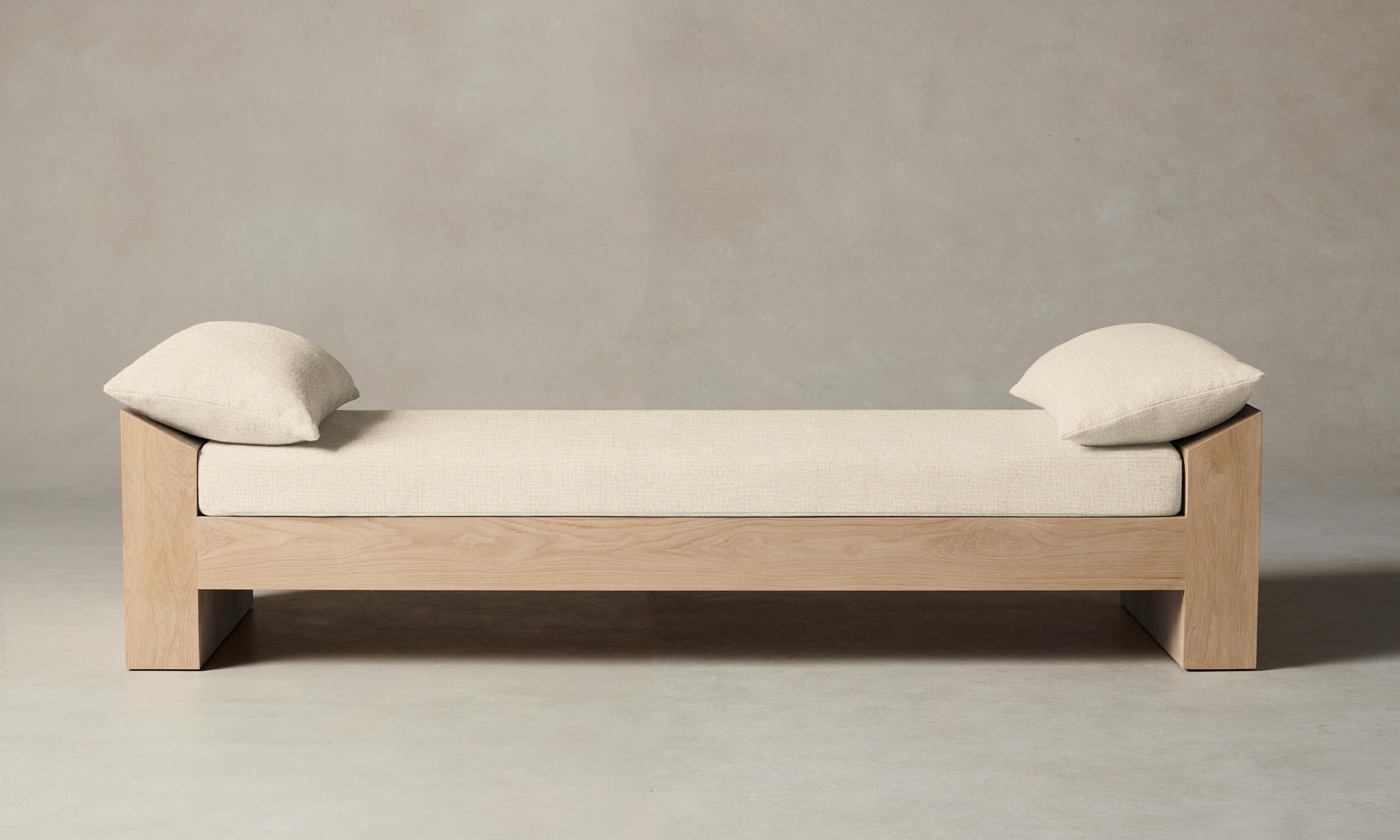 The Montauk daybed is a sanctuary for relaxation. Its low-lying frame cradles a plush cushion and soft pillows that invite a sense of serenity.