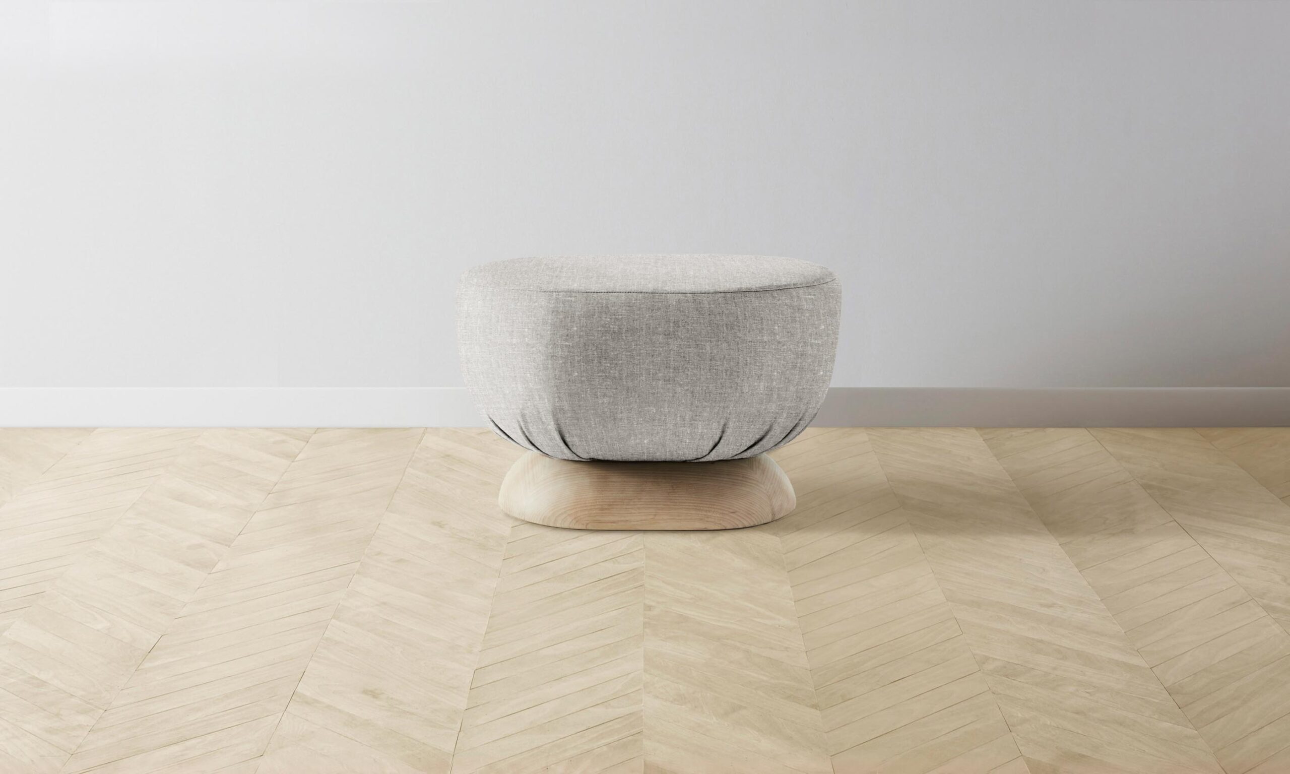 Characterized by its distinctive sculptural shape, the Mott stool is traced with smooth curves on all sides. It has a masterfully upholstered seat and sits atop an ash base.