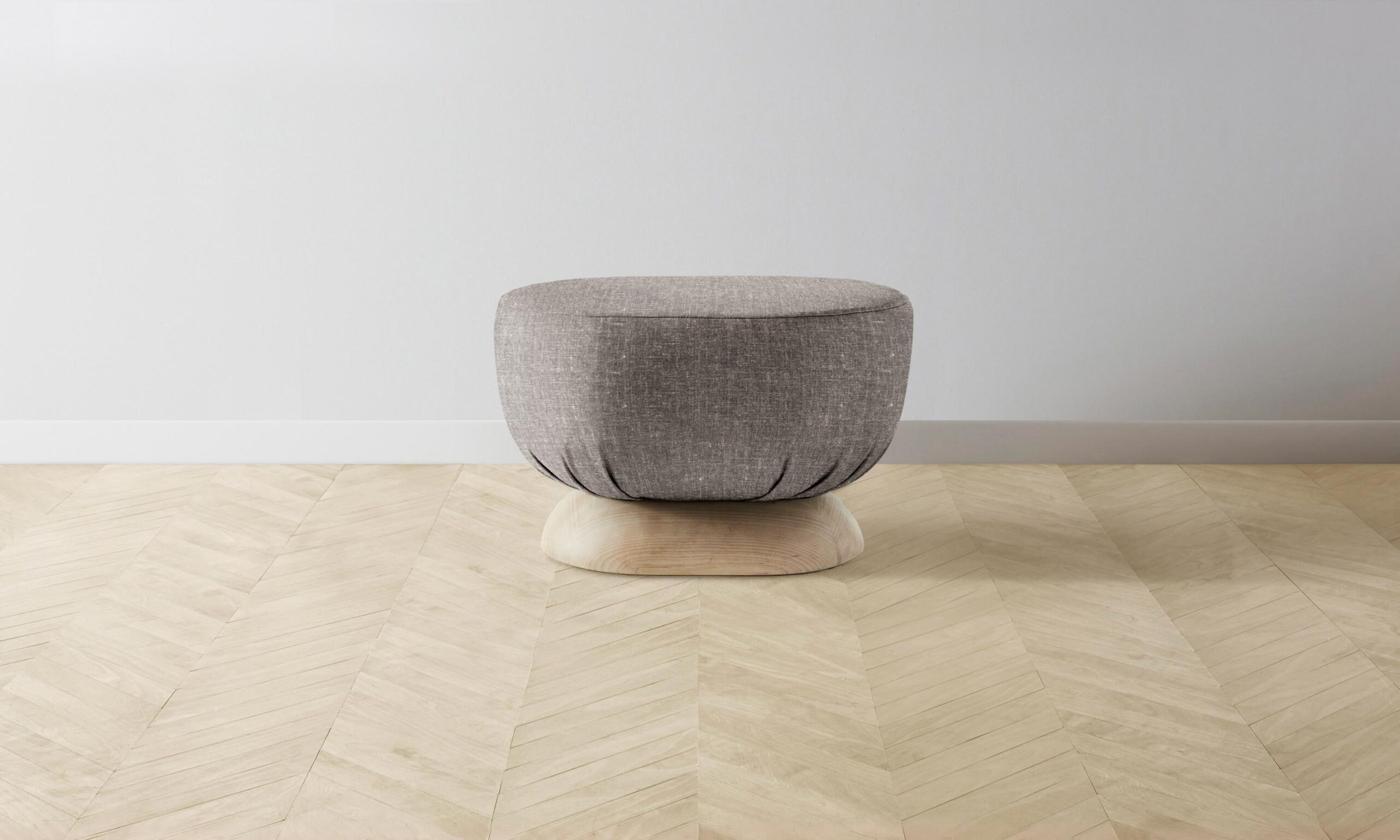 Characterized by its distinctive sculptural shape, the Mott stool is traced with smooth curves on all sides. It has a masterfully upholstered seat and sits atop an ash base.
