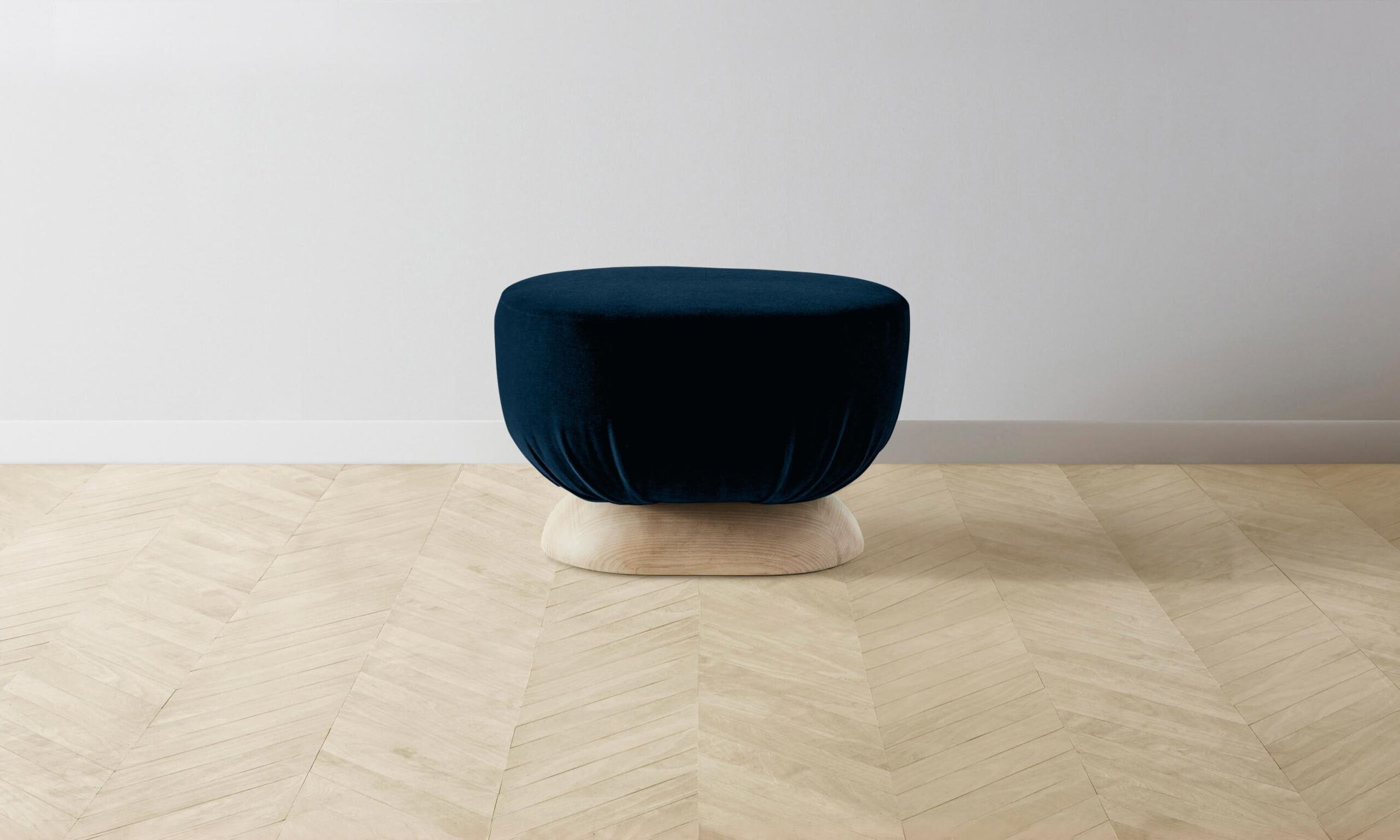 Characterized by its distinctive sculptural shape, the Mott stool is traced with smooth curves on all sides. It has a masterfully upholstered seat and sits atop an ash base.