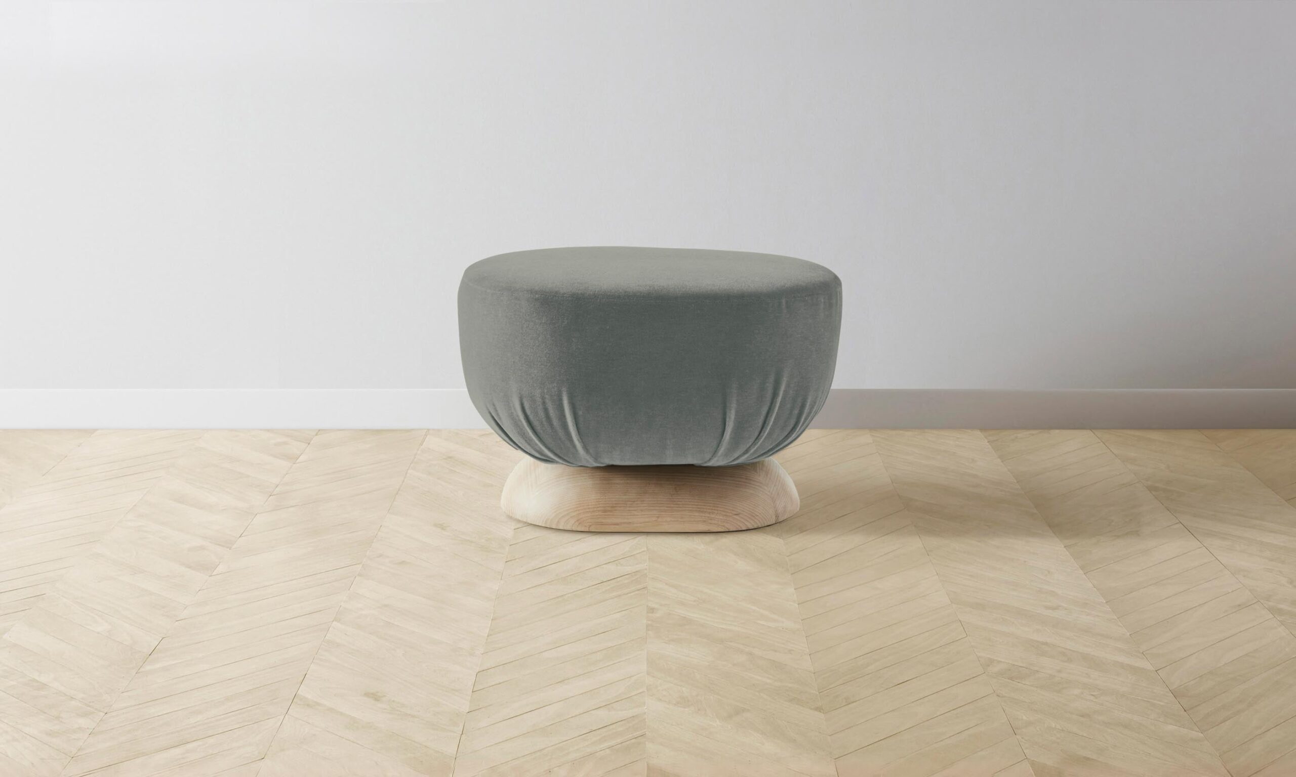 Characterized by its distinctive sculptural shape, the Mott stool is traced with smooth curves on all sides. It has a masterfully upholstered seat and sits atop an ash base.