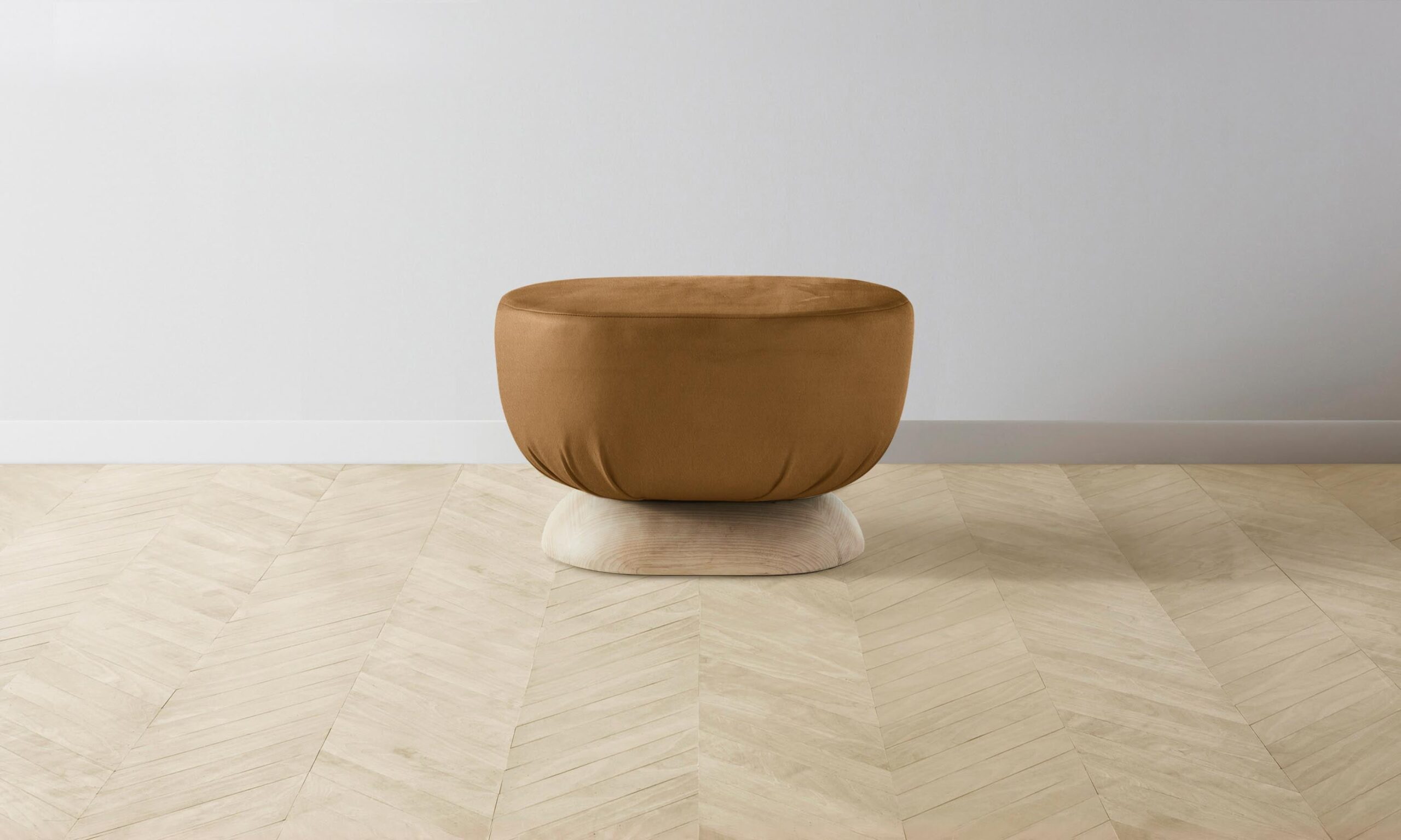 Characterized by its distinctive sculptural shape, the Mott stool is traced with smooth curves on all sides. It has a masterfully upholstered seat and sits atop an ash base.