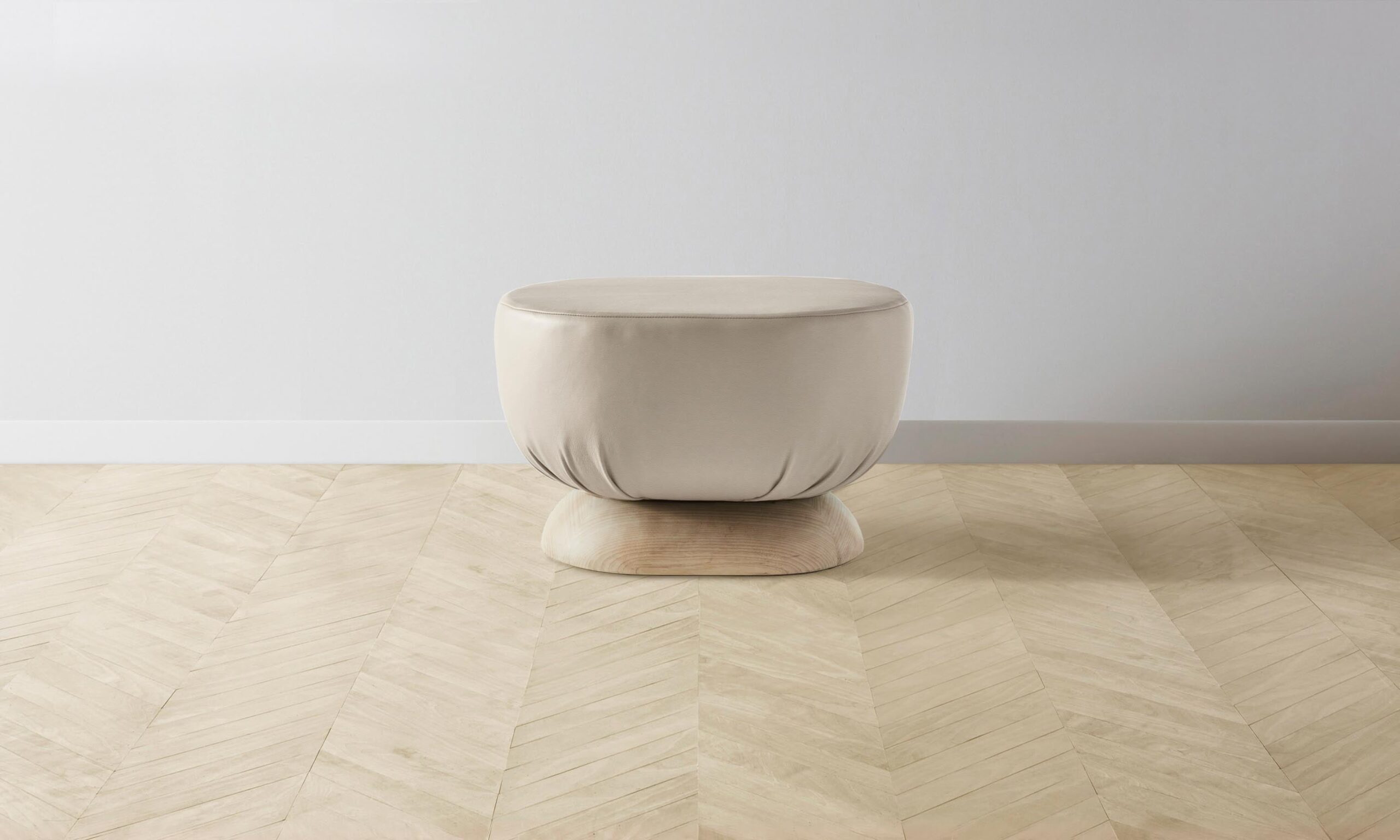 Characterized by its distinctive sculptural shape, the Mott stool is traced with smooth curves on all sides. It has a masterfully upholstered seat and sits atop an ash base.