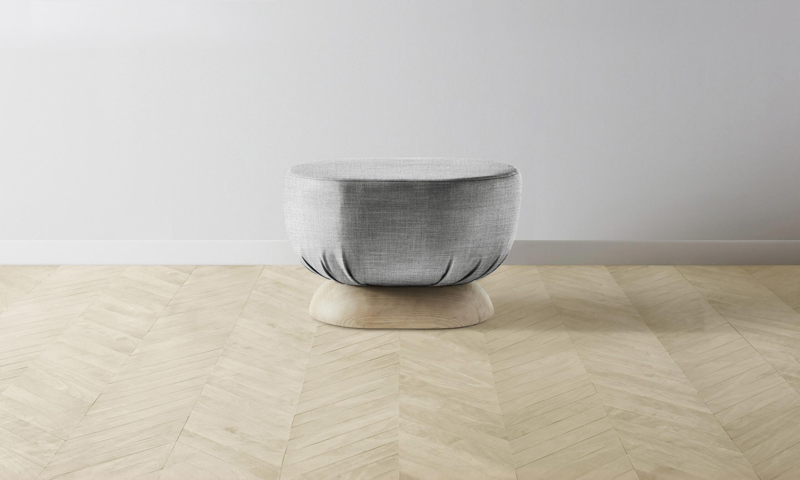 Characterized by its distinctive sculptural shape, the Mott stool is traced with smooth curves on all sides. It has a masterfully upholstered seat and sits atop an ash base.