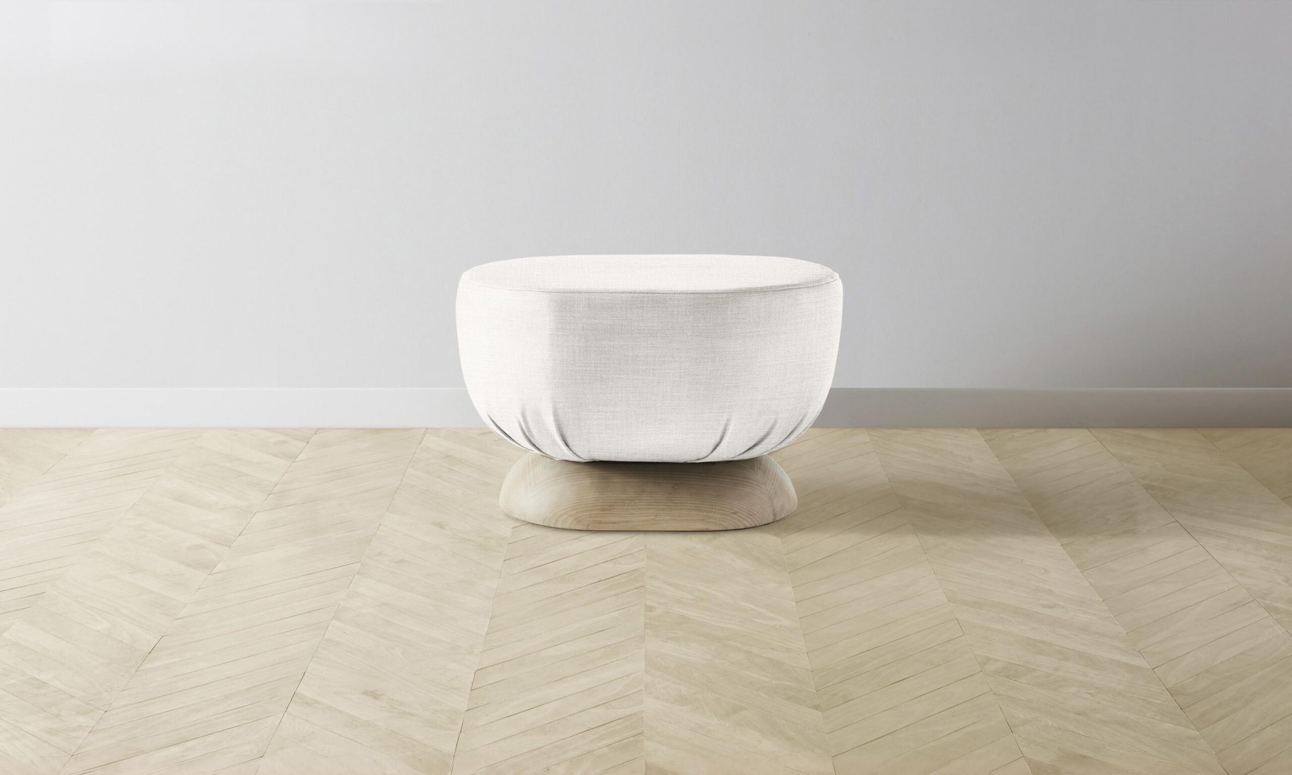 Characterized by its distinctive sculptural shape, the Mott stool is traced with smooth curves on all sides. It has a masterfully upholstered seat and sits atop an ash base.